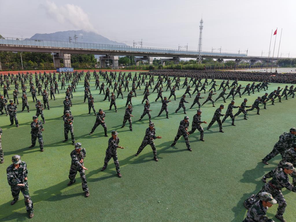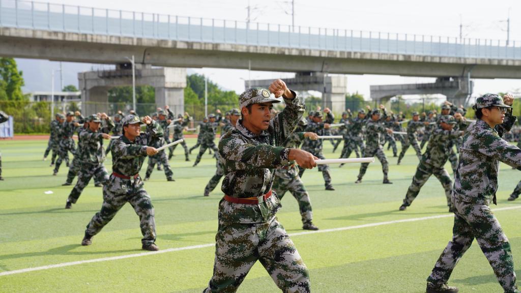 迷彩青春,淬火成钢。全体参训新生精神抖擞,以饱满的热情和昂扬的斗志投入到军训科目会操中。列队方阵步步铿锵、口号嘹亮,展现出新时代大学生蒸蒸日上的蓬勃朝气;匕首操、捕俘拳、擒敌拳动作果敢、威风凛凛,展现出当代大学生艰辛磨练后的坚韧意志;应急长棍、应急短棍气势如虹,虎虎生风,展现出不畏强敌的浩然正气;战术演练力贯千钧、锐不可挡,展现出灵活的战术运用和顽强的战斗精神,整个军训科目会操赢得了现场阵阵掌声。