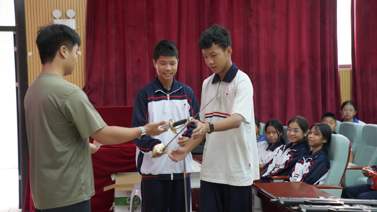 报告厅内整齐摆放了礼宾枪、95突击步枪、指挥刀各种模型及全套礼服,队员们并逐一进行专业讲解。在互动环节,现场学生积极举手提问,队员们详细介绍军事装备的名称、功能,还分享装备背后的荣誉故事,让孩子们明白,这些装备不仅是维护和平的“武器”,更是国家实力与军人使命的象征。