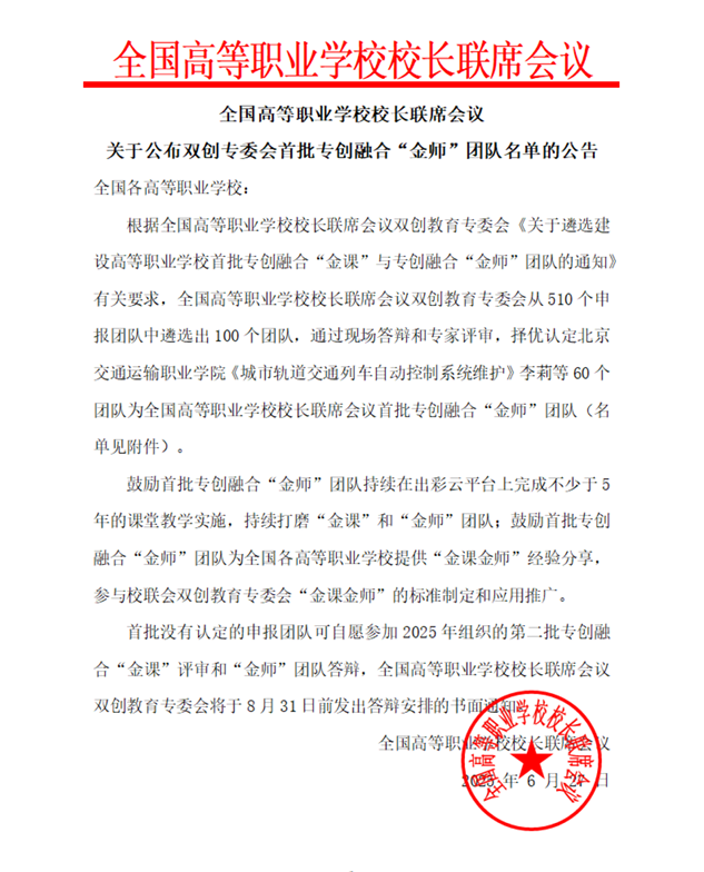 近日,全国高等职业学校校长联席会议双创教育专委会公布首批专创融合“金师”团队名单,我校 《装配式混凝土建筑施工》、《品牌展示设计》凭借出色的专创融合教学实践,从 510 个申报团队、经遴选后的 100 个团队中突围,成功入选全国 60 个首批专创融合“金师”团队,与北京交通运输职业学院等优秀院校教师团队并肩。