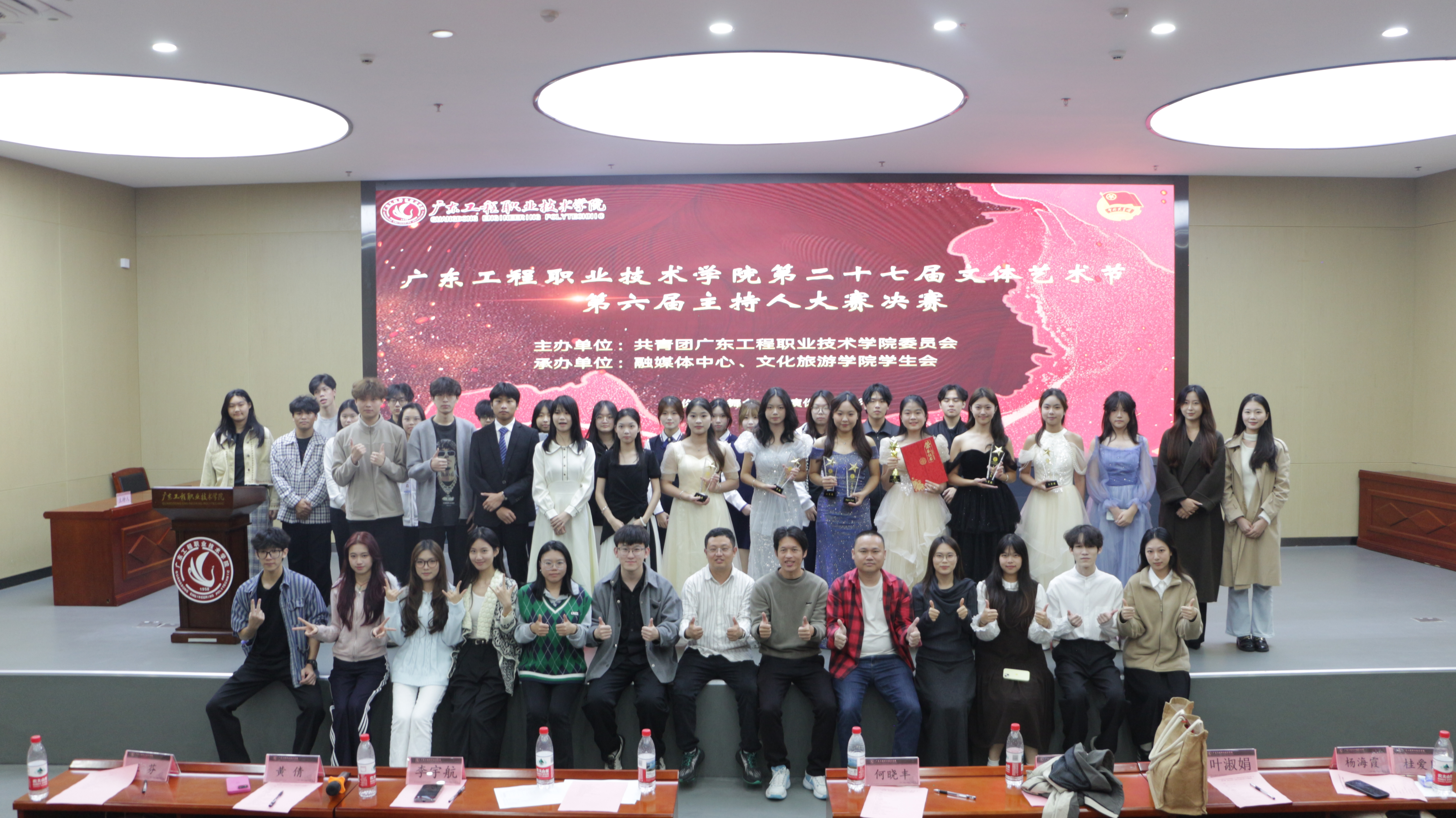 本次大赛以 “青春逢盛世 奋斗向未来” 为主题,由共青团广东工程职业技术学院委员会主办,文化旅游学院承办,校融媒体中心与文化旅游学院学生会联合协办。时值抗战胜利 80 周年,大赛以语言为载体,既为缅怀先烈、传承红色基因搭建了生动的表达平台,也为发掘校园主持新秀、锤炼学子语言表达能力提供了优质舞台。文化旅游学院党委书记桂爱民、校团委社团工作部部长何晓丰等领导嘉宾莅临现场指导,为选手们加油鼓劲!