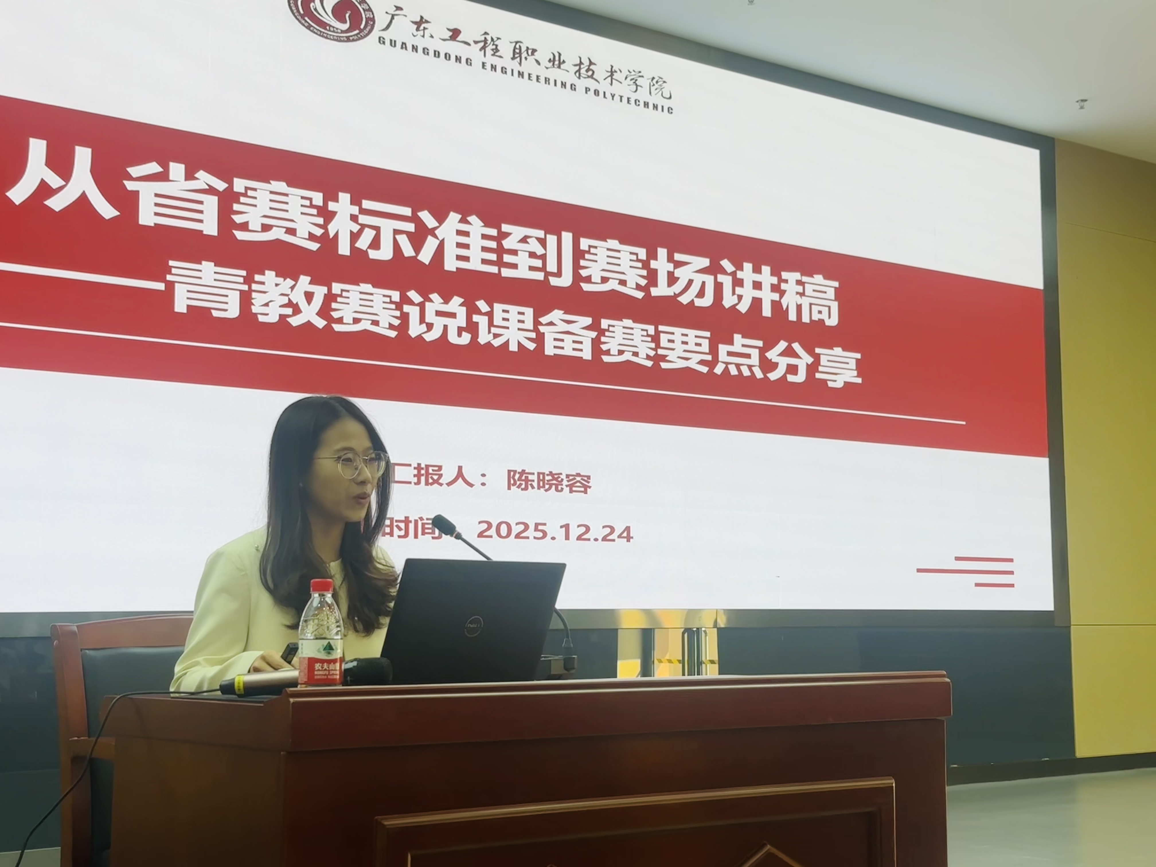 我校文化旅游学院旅游管理专业负责人陈晓容老师,获得广东省第七届高校(高职)青年教师教学大赛一等奖等多项荣誉。她以《从省赛标准到赛场讲稿——青教赛说课备赛要点分享》为题,结合自身实战经验,系统梳理了从赛制规则解读到教学设计优化、从课堂呈现技巧到语言表达锤炼的全流程备赛要点,拆解了省赛标准与赛场讲稿的转化路径,分享了技术环节打磨、心态调整等实用技巧,为青年教师明晰了备赛方向、提供了方法指引。