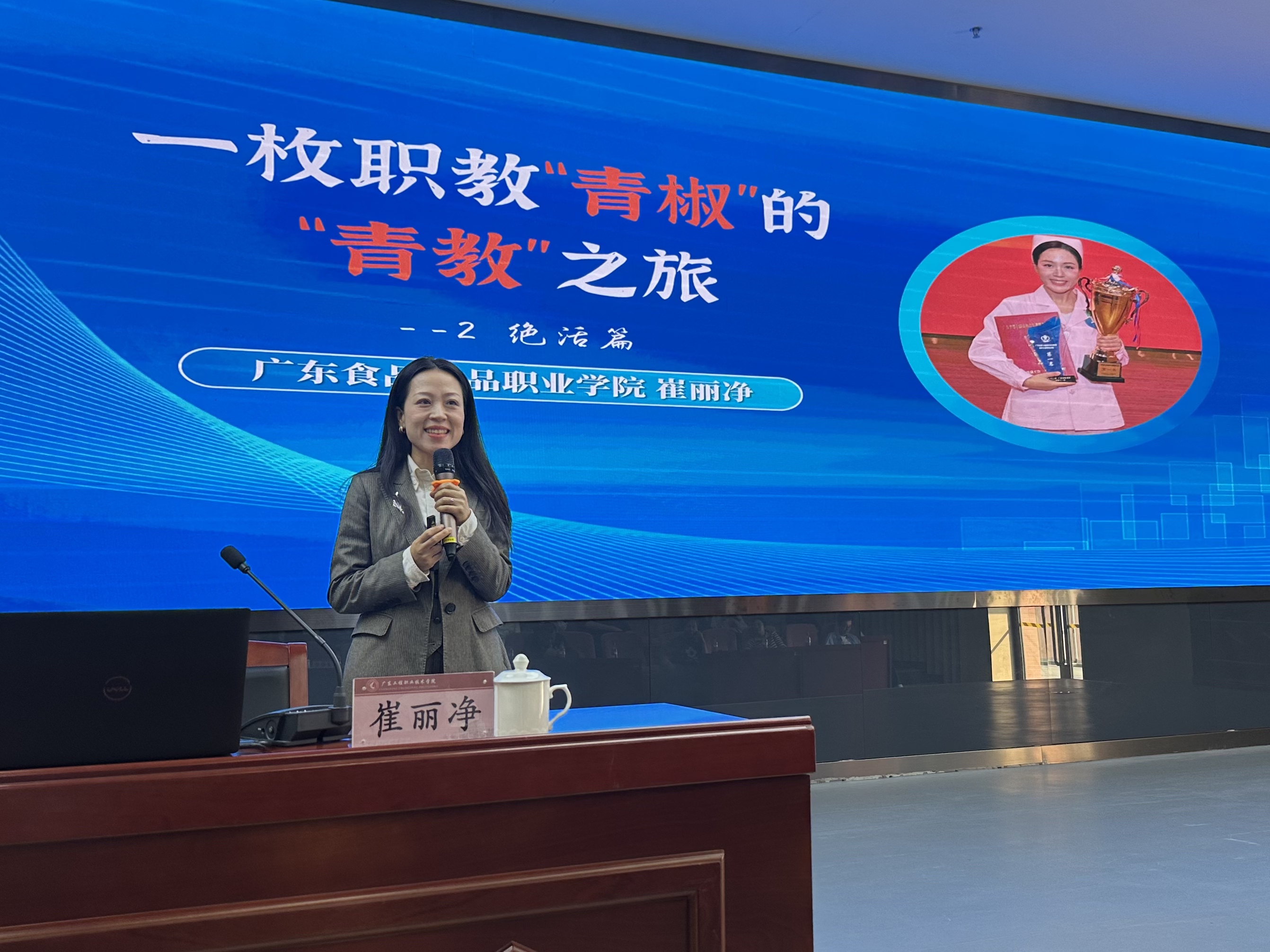 广东食品药品职业学院护理专业主任崔丽净博士,是广东省第七届青年教师大赛理工综合组冠军、广东省五一劳动奖章获得者。她以《一枚职教青椒的青教之旅》为题,从自身参赛的心路历程出发,围绕“以学生为落脚点”的育人理念,深刻阐释了说课“特色”打造与教学“绝活”锤炼的核心要义,强调教学要实现艺术性、技术性与教育性的完美统一,其匠心育人的理念与创新教学的方法让在场教师深受启发。