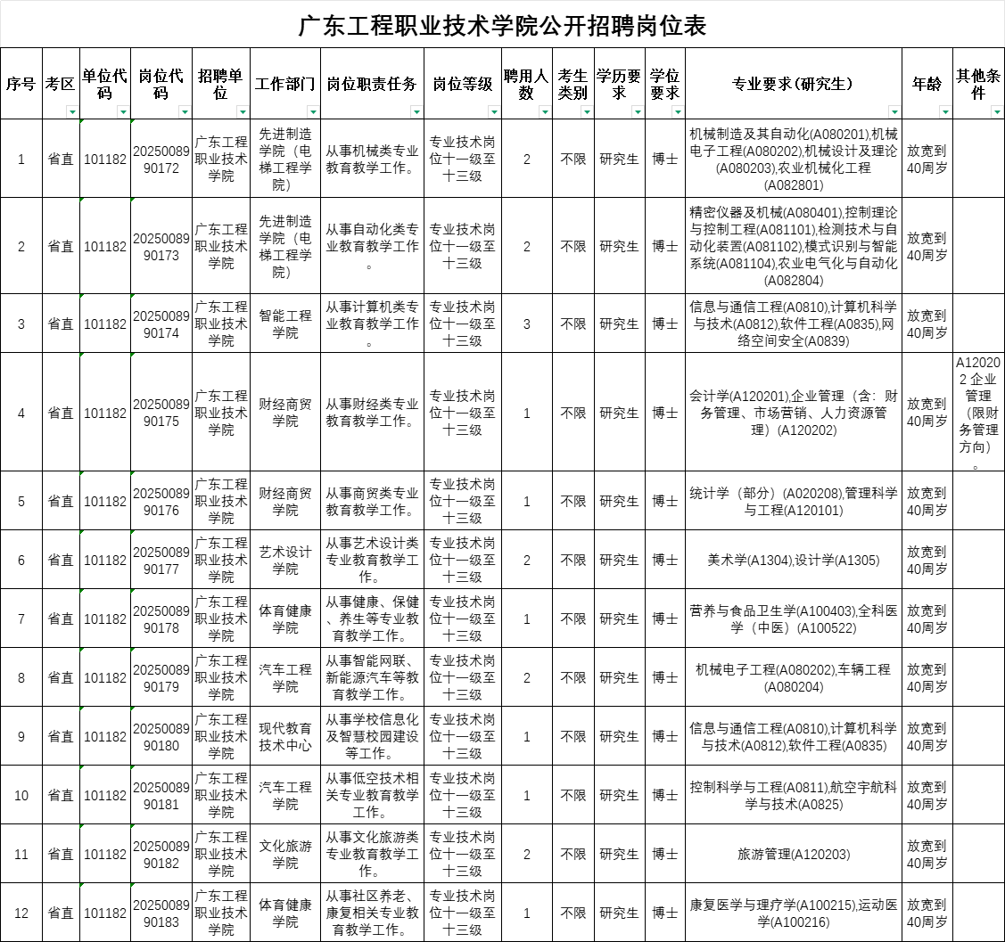 现因发展需要,我校参加了由中共广东省委组织部、广东省人力资源和社会保障厅组织开展的广东省事业单位2025年集中公开招聘高层次和急需紧缺人才第三轮招聘工作,共公开招聘高层次人才19名,获聘人员为事业单位编制人员,欢迎符合招聘条件的人才报考我校(归属考区:省直,单位代码:101182,岗位代码:2025008990172-2025008990183),岗位具体信息如下: