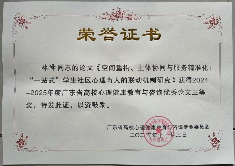 此外,心理中心副主任郭凯娟获评“优秀心理中心主任(负责人)”称号,其提交的论文荣获一等奖;并受邀在大会上进行论文交流,展现了我校在该领域的专业深度与影响力。中心老师查嫣芸、林峰撰写的论文分别荣获三等奖。