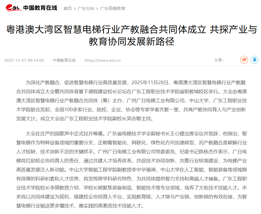 此次粤港澳大湾区智慧电梯行业产教融合共同体的成立,搭建了产业与教育深度对接的桥梁。未来,共同体将进一步整合资源,推动校企合作、产学研协同创新,为粤港澳大湾区智慧电梯行业输送更多高素质人才,助力行业实现高质量发展新突破。