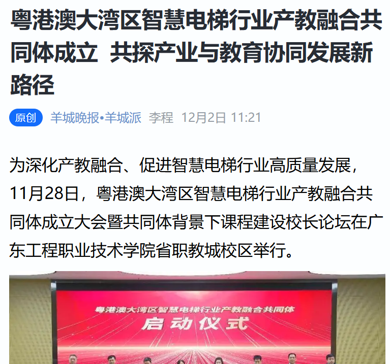 为深化产教融合、促进智慧电梯行业高质量发展,11月28日,粤港澳大湾区智慧电梯行业产教融合共同体成立大会暨共同体背景下课程建设校长论坛在广东工程职业技术学院省职教城校区举行。