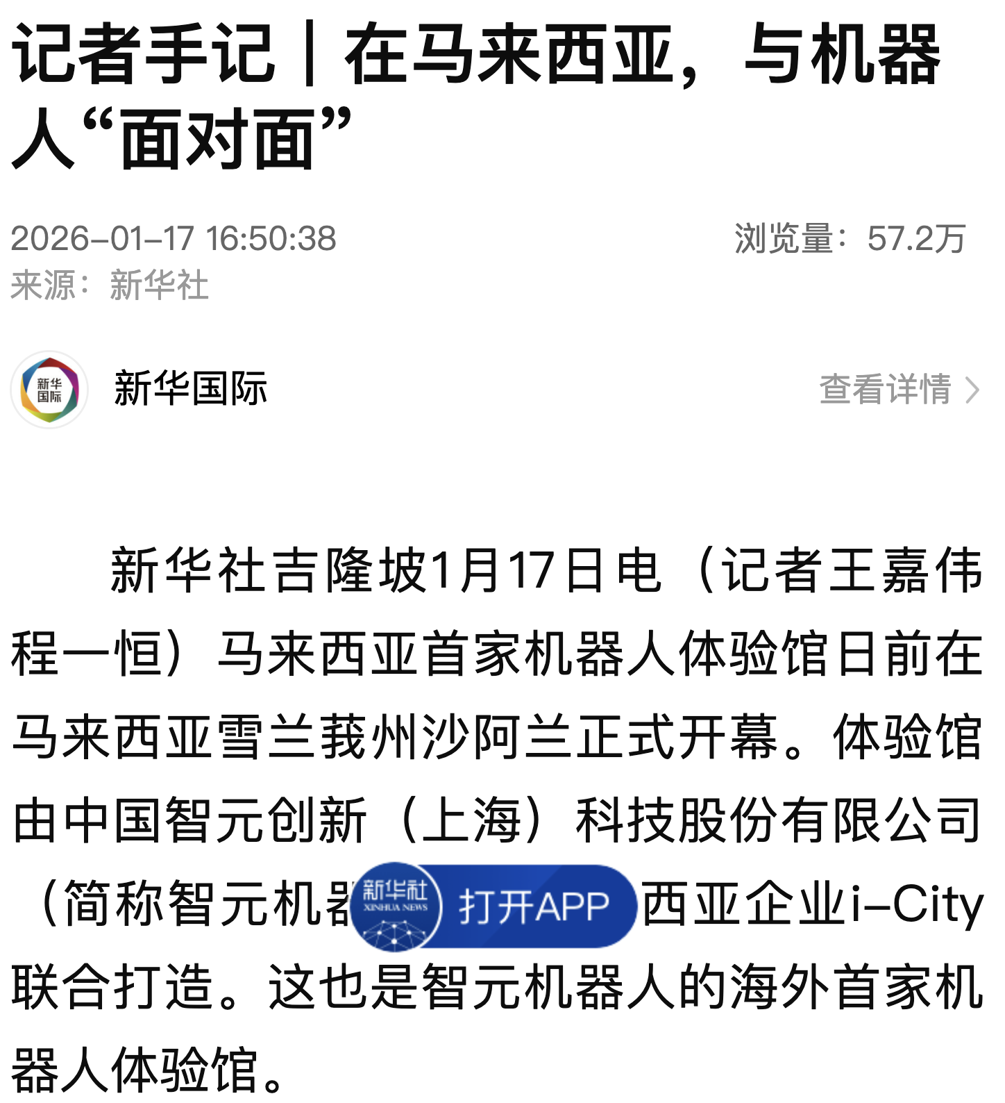 新华社吉隆坡1月17日电(记者王嘉伟 程一恒)马来西亚首家机器人体验馆日前在马来西亚雪兰莪州沙阿兰正式开幕。体验馆由中国智元创新(上海)科技股份有限公司(简称智元机器人)与马来西亚企业i-City联合打造。这也是智元机器人的海外首家机器人体验馆。