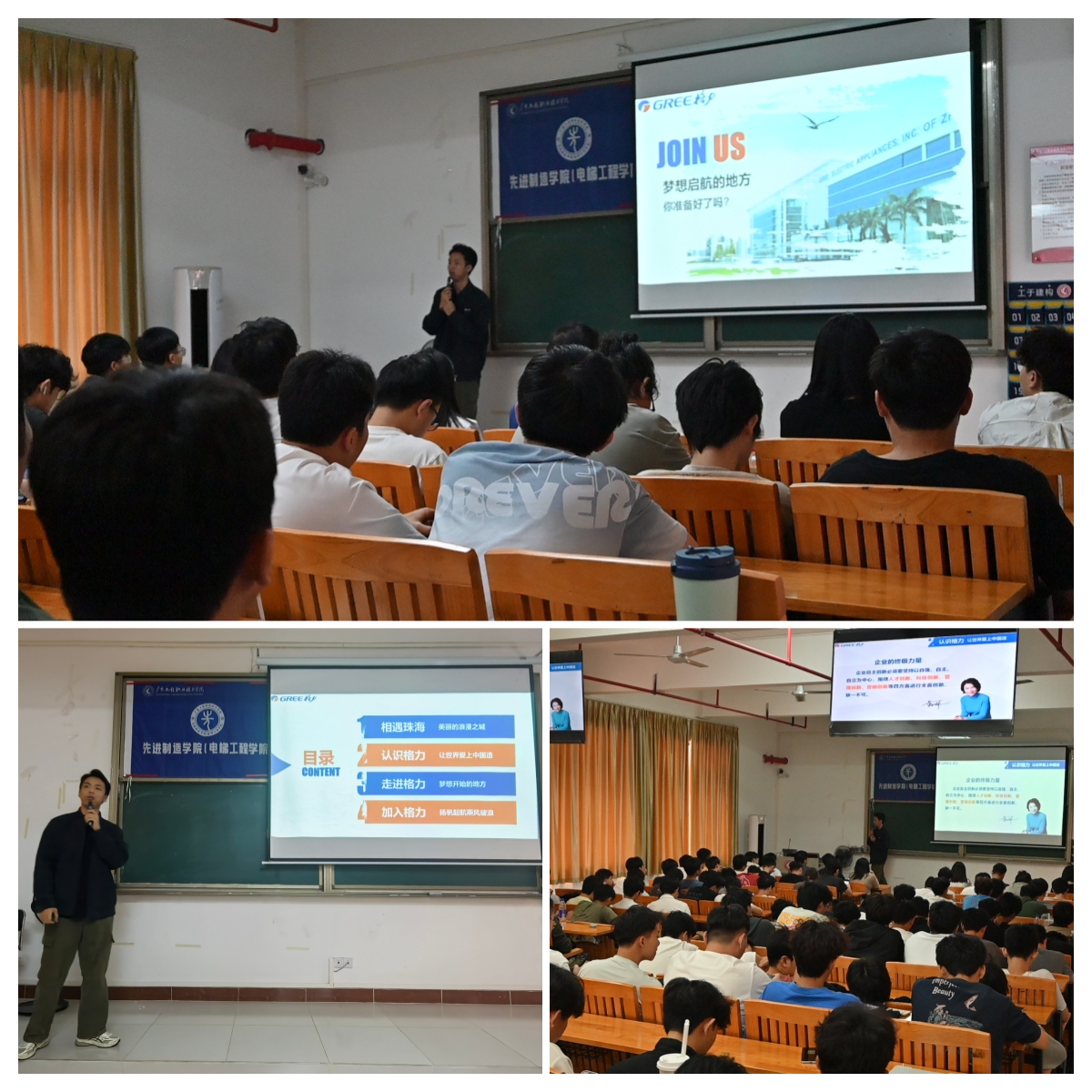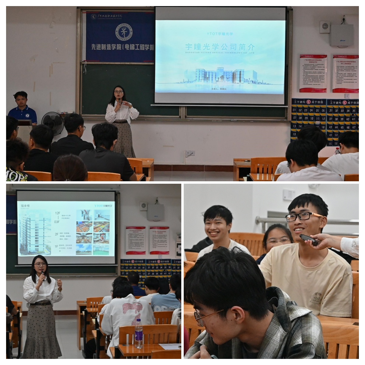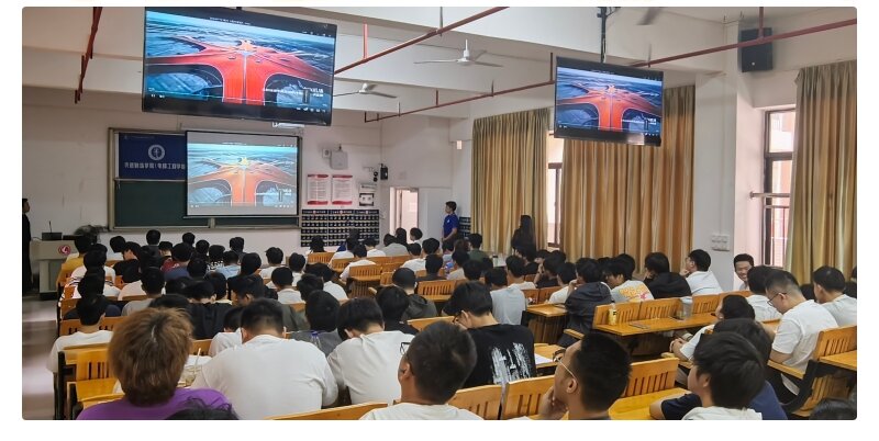 活动伊始,学院对来校招揽人才的两家企业代表们表示欢迎,介绍了2026届毕业生的专业概况、毕业生人数以及实习计划等情况,希望未来在校企合作、人才培养、企业招聘等方面持续深化合作。紧接着,东莞市宇瞳光学科技股份有限公司校招负责人袁佩如女士、珠海格力电器股份有限公司招聘经理杜光澎先生依次上台宣讲,通过生动的宣传片,两家企业向在场学生全面展示了企业的发展历程、企业文化、业务领域、晋升通道以及此次招聘的岗位要求、薪酬福利和未来发展规划,宣讲内容详实具体,不仅让学生们对企业有了直观深入的了解,更感受到了各家企业对招贤纳才的满满诚意。在互动问答环节,学生们就自己所关心的专业契合度、职业发展空间、培训体系等问题积极提问,企业代表均给予了耐心细致的解答,现场互动频繁,掌声不断。