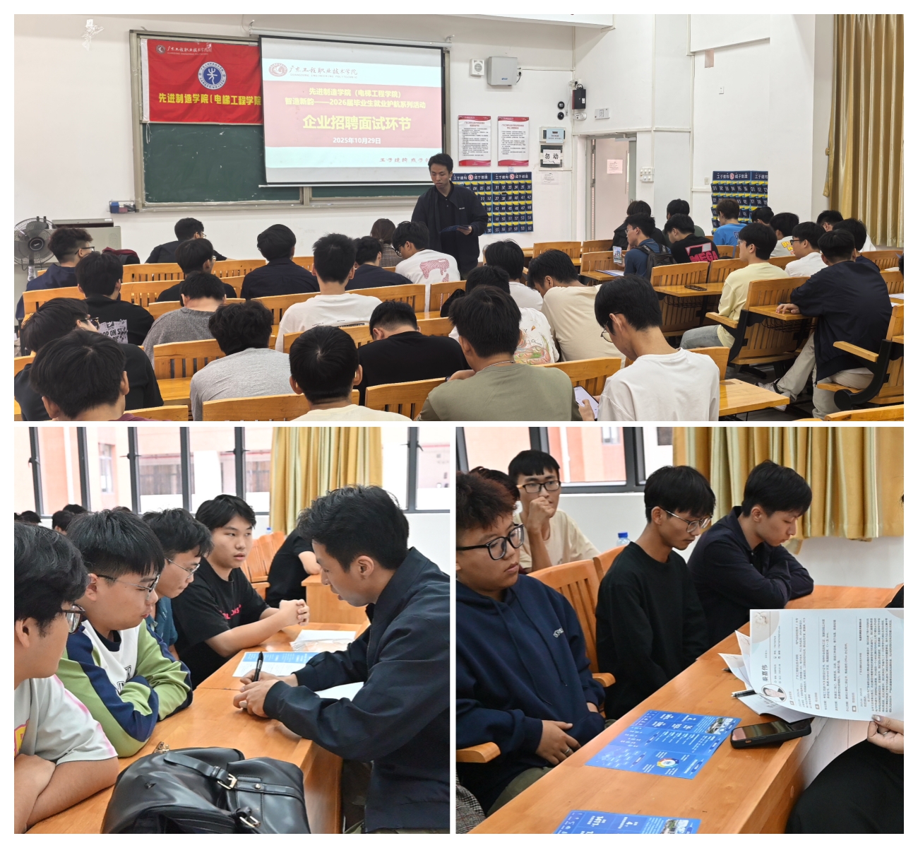 为深入贯彻落实国家关于促进高校毕业生就业的决策部署,全力拓宽2026届毕业生就业渠道,助力学院2026届毕业生更加充分更高质量就业,不断推动“访企拓岗”专项行动走深走实。10月29日,先进制造学院(电梯工程学院)在省职教城校区教学楼1号楼Q1-113、Q1-114举办“智”造新梯,职通未来——就业护航系列活动暨企业宣讲招聘双选会。本次活动邀请东莞市宇瞳光学科技股份有限公司、珠海格力电器股份有限公司两家企业代表进校宣讲招聘,活动吸引了2026届机电一体化技术、电气自动化技术、工业机器人技术等毕业生共160人踊跃参加。