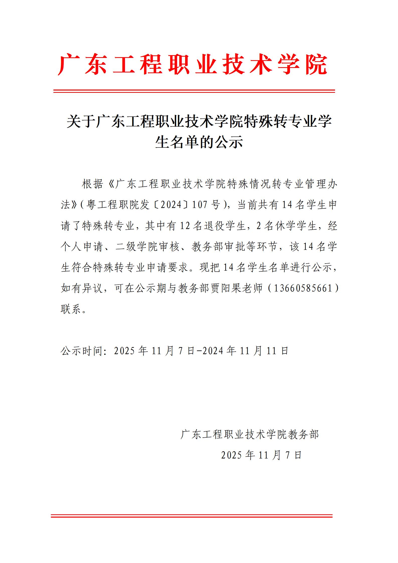 关于广东工程职业技术学院特殊转专业学生名单的公示