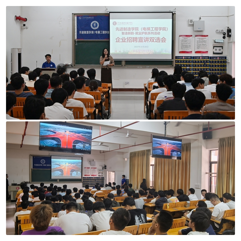 为深入贯彻落实国家关于促进高校毕业生就业的决策部署,全力拓宽2026届毕业生就业渠道,助力学院2026届毕业生更加充分更高质量就业,不断推动“访企拓岗”专项行动走深走实。10月29日,先进制造学院(电梯工程学院)在省职教城校区教学楼1号楼Q1-113、Q1-114举办“智”造新梯,职通未来——就业护航系列活动暨企业宣讲招聘双选会。本次活动邀请东莞市宇瞳光学科技股份有限公司、珠海格力电器股份有限公司两家企业代表进校宣讲招聘,活动吸引了2026届机电一体化技术、电气自动化技术、工业机器人技术等毕业生共160人踊跃参加。