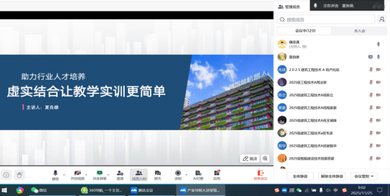 三个产业导师、五场讲座,内容涵盖数字孪生技术、建筑机器人应用、虚拟实训教学、成果申报转化四大核心板块,累计吸引近500人次师生参与。专家们以深厚的行业积淀、详实的案例分析和深入的互动,为师生搭建了与行业前沿对话的桥梁。