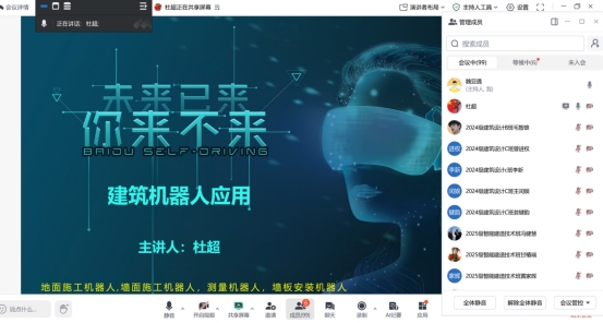 广州瑾和建筑劳务有限公司杜超总经理带来“建筑机器人应用”专题讲座。他从行业痛点切入,剖析了建筑机器人在减轻体力劳动、降低安全风险等方面的核心价值,解读其从单一功能向集成化、人工操控向智能化的演进趋势。通过详实数据,他展示了四轮激光整平机器人、墙面抹灰机器人等三大类产品的技术参数与应用优势,并结合广州白云机场T3航站楼等大型项目案例,分享了机器人应用的实践经验,同时坦诚分析了当前行业面临的设备价格、配件通用性等挑战及破解路径。