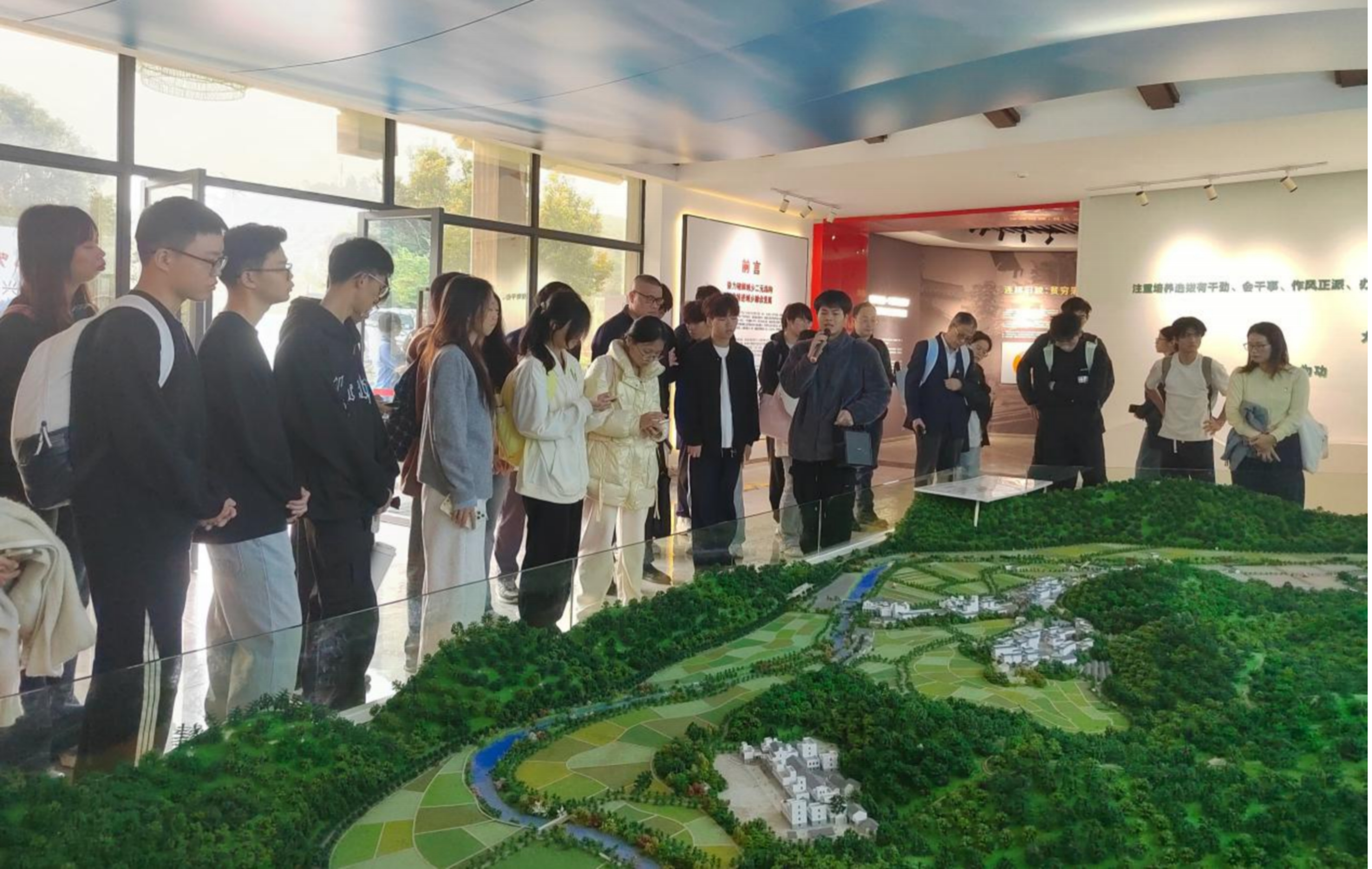 在村党组织负责人的带领下,师生一行首先走进“连樟客厅”,通过珍贵图片、详实数据和实物展示,系统了解连樟村在党建引领下,通过“党总支部+直属支部+核心支部”模式凝聚发展合力,以“党支部提事、村民理事会议事”民主决策机制破解发展难题的奋斗历程,深刻体会“党建是乡村振兴的主心骨”的实践意义。