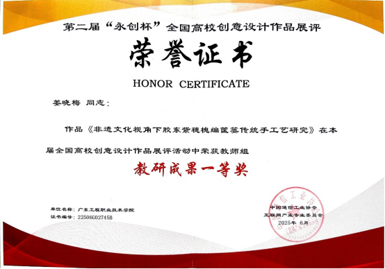 其中,姜晓梅老师的教研成果《非遗文化视角下胶东紫惠槐编筐篓传统手工艺研究》荣获教师组教研成果一等奖;黎智宇、林小阳、黄晓峰同学的作品《愿你成为自己的光》获学生组一等奖;余晨瑛同学《一生的旅程》与蔡慧欣同学《清肌坊VI设计》分获学生组二等奖;陈娇霞、朱玟燕、余晨瑛同学合作的《青风瓷韵》以及谢佩桡同学《广东醒狮文化互动体验》获学生组三等奖。