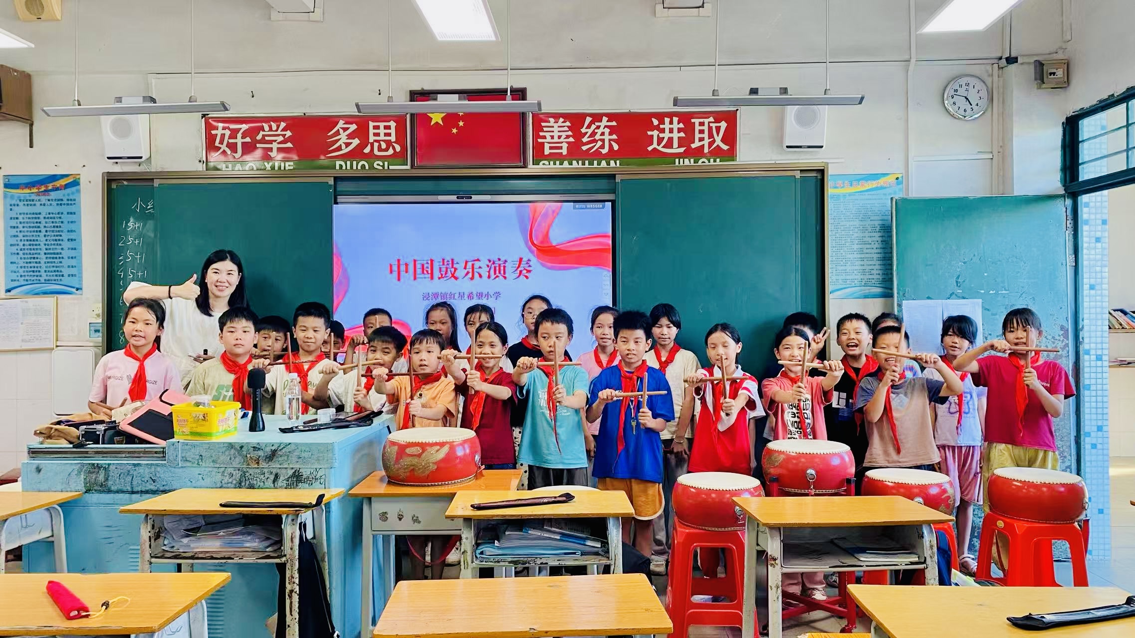 浸潭镇大湾岗小学的校园里,中华鼓乐的激昂交织出独特的美育乐章。中华鼓乐课堂上,温洁芸老师带着孩子们开启“鼓韵寻根”之旅,从腰鼓、堂鼓的历史渊源讲起,再手把手指导握槌姿势与基础鼓点。“咚咚锵”的鼓点从杂乱到整齐,孩子们在团队齐奏中体悟传统文化的磅礴力量,脸上洋溢着专注与自豪。