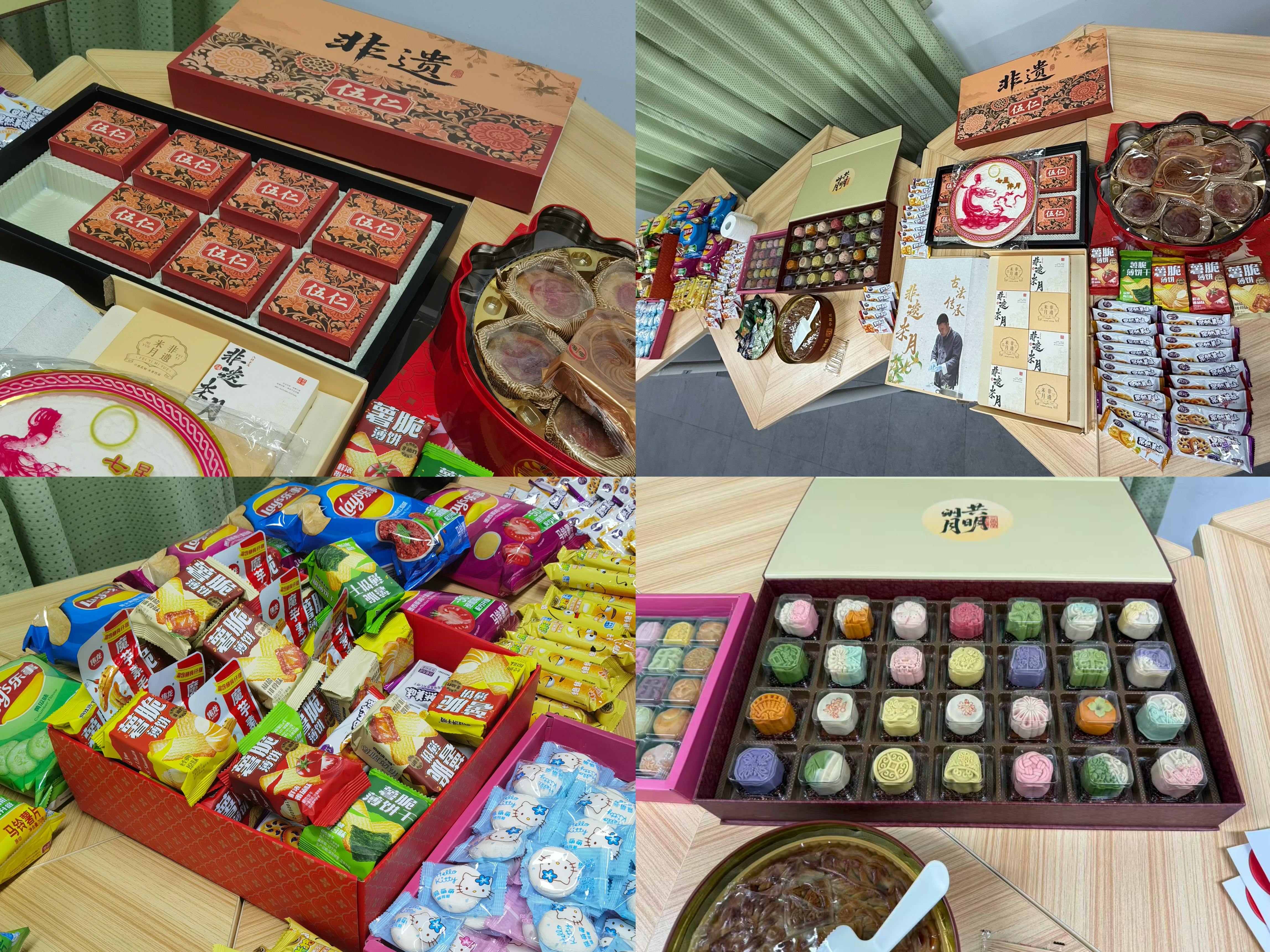 茶歇时段更是温馨满满。非遗造型月饼、缤纷果汁、披萨、蛋糕卷等美食琳琅满目,搭配古风造景,营造出浓厚的节日氛围。教师们边品尝茶点边交流互动,场面融洽而温暖。