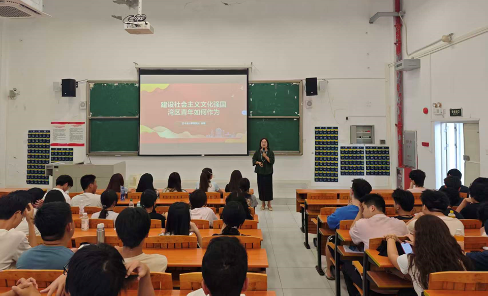 郭希围绕“建设社会主义文化强国 湾区青年如何作为”,从文化强国的核心内涵切入,分析了当前全球文化竞争态势与中国文化“走出去”的战略意义。她指出,粤港澳大湾区凭借岭南文化、海洋文化等多元资源,以及科技创新优势,为艺术设计专业学生提供了广阔的发展空间。结合 “广彩新韵” 服饰设计、“粤剧数字艺术馆”等湾区青年文化创新案例,她详细讲解了传统文化与现代设计融合的方法,包括从传统纹样的现代转化,到数字技术赋能文化传播,再到设计助力乡村振兴(如为畲族村“蓝屋花蜜”设计包装)。她鼓励同学们发挥专业所长,既要深入挖掘中华优秀传统文化精髓,又要善用 AI、AR 等新技术,用国际通用的设计语言讲好中国故事与湾区故事,在文化强国建设中展现艺术设计学子的担当。