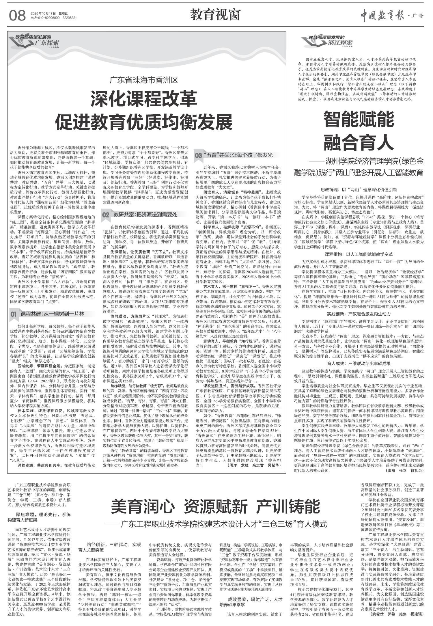 2025年10月17日《中国教育报》刊发文章《美育润心 资源赋新 产训铸能——广东工程职业技术学院构建艺术设计人才“三仓三场”育人模式》。