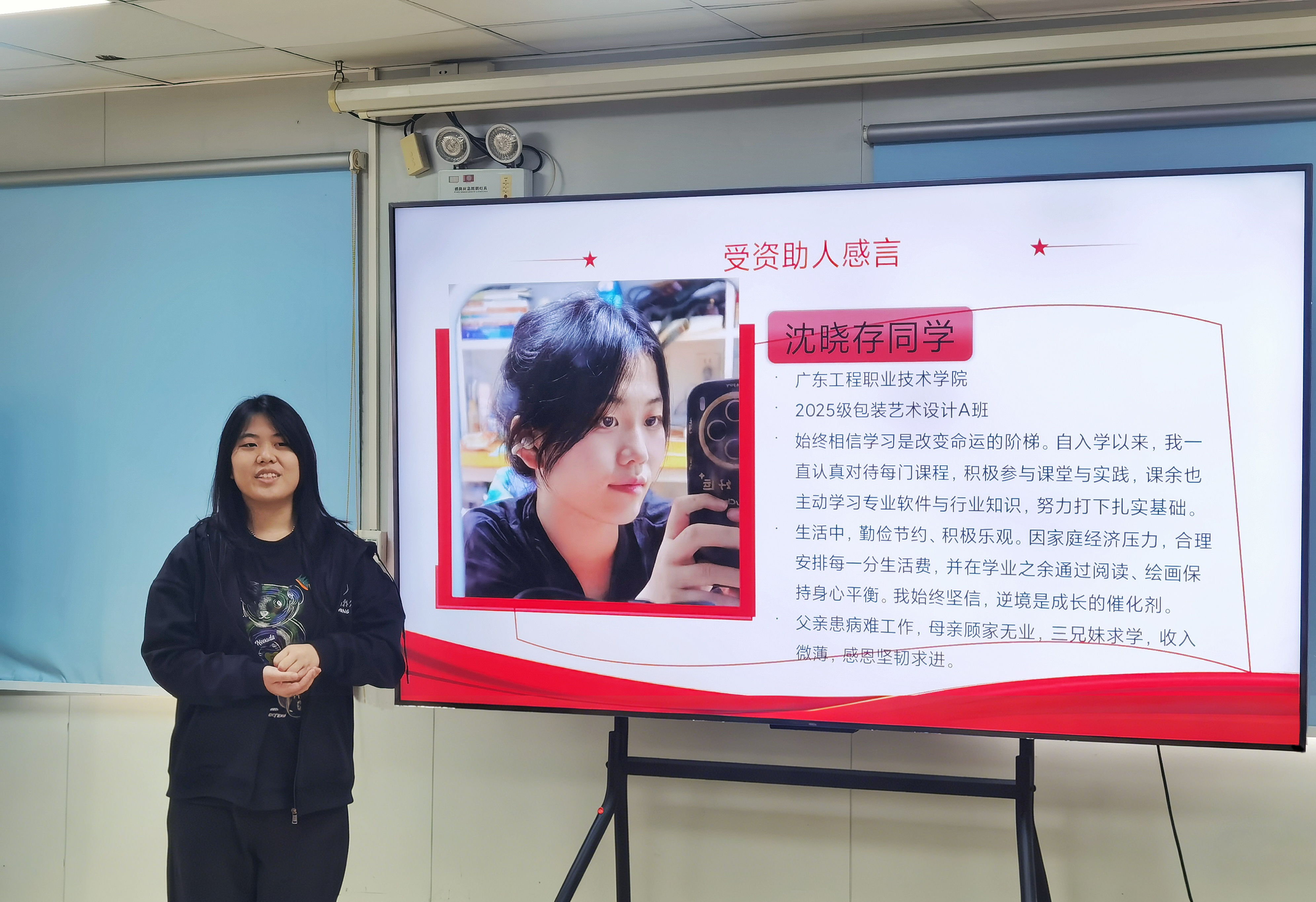 捐赠仪式上,5名受助学生代表依次分享了各自在逆境中奋进的励志故事。“父母务农收入微薄,妹妹患病的医疗费曾让我险些放弃学业,是国家助学金和爱心企业的资助让我能安心求学。”2024级虚拟现实技术应用C班学生吴嘉莹率先发言,言语间满是感恩,她坚定表示,未来将投身乡村教育事业,把这份温暖传递给更多需要帮助的孩子。2025级数字媒体艺术设计E班刘颖诗从专业实践视角分享感悟:“资助不仅解决了学费难题,更让我有机会参与非遗美育实践,后续我将用设计技能为乡村文化赋能,以实际行动回馈社会。”2025级包装艺术设计A班沈晓存、2025级数字媒体艺术设计E班梁文明等学生代表也相继发言,结合自身家庭困境讲述受助经历,均表达了“受助思源、励志奋进、传递爱心”的决心,承诺将积极践行志愿精神,用专业能力反哺社会。