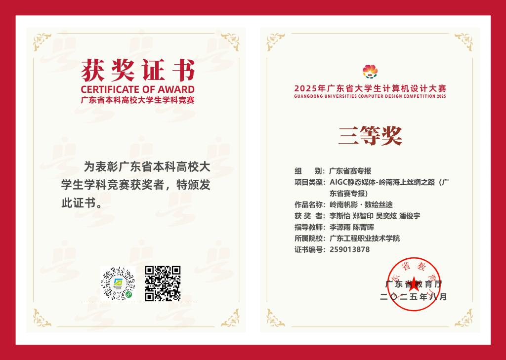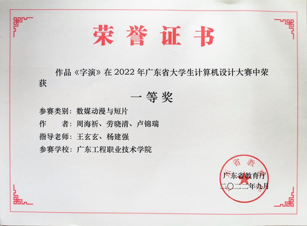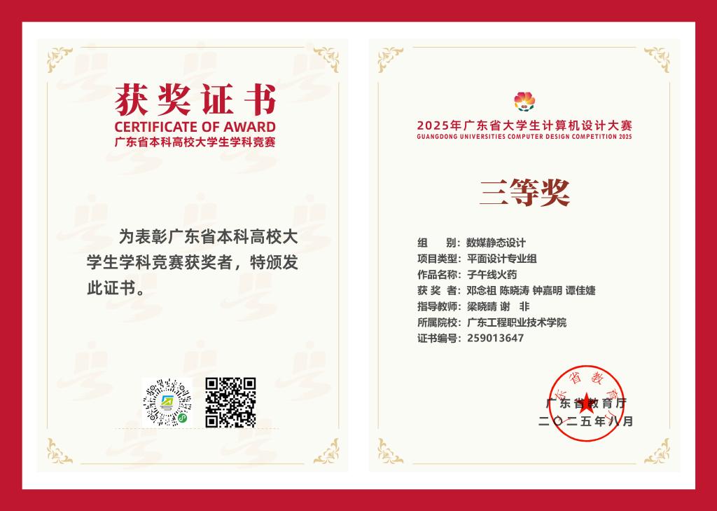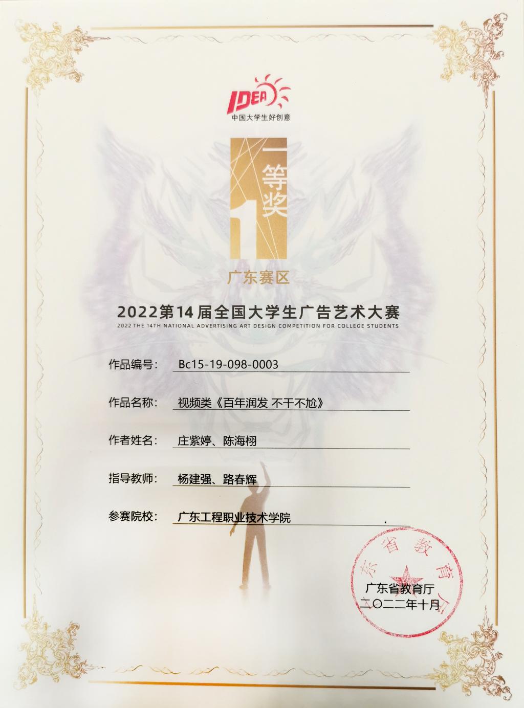 分别获得视频类一等奖,平面类二等奖,广东省教育厅