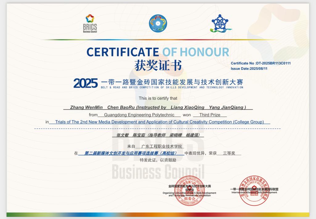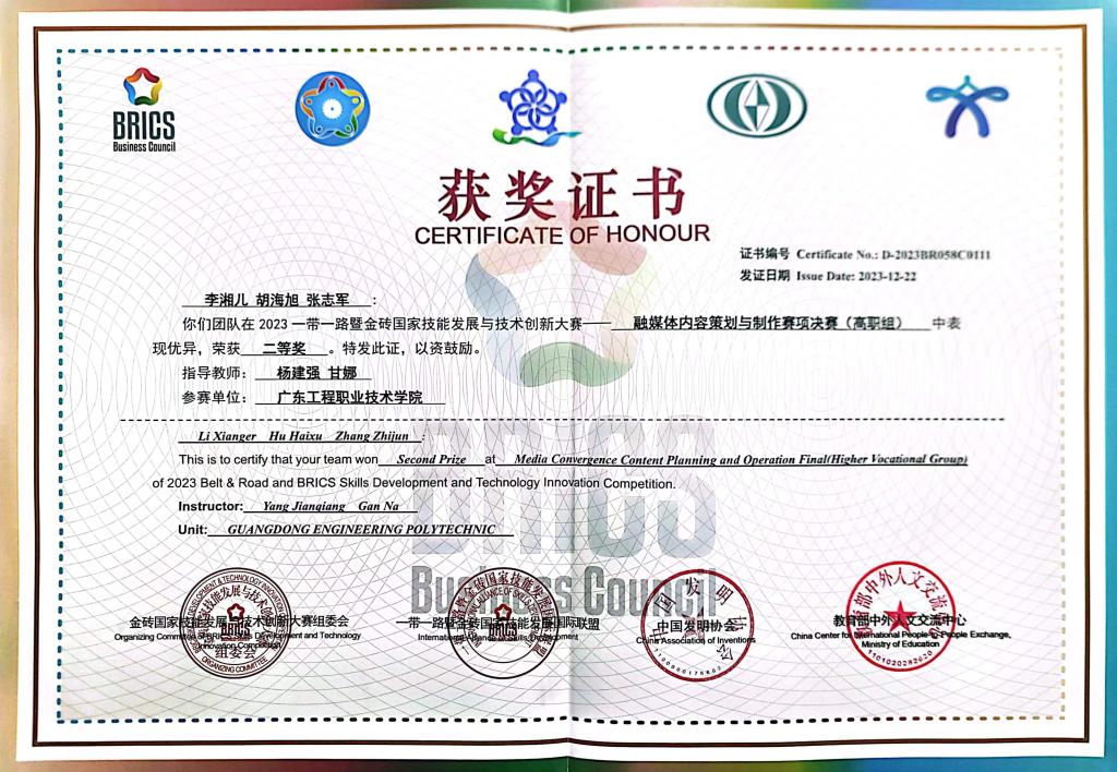 2023 指导学生参加一带一路暨金砖国家技能发展与技术创新大赛--融媒体内容策划与制作赛项获得国赛决赛二等奖1项,荣获赛事优秀指导教师称号