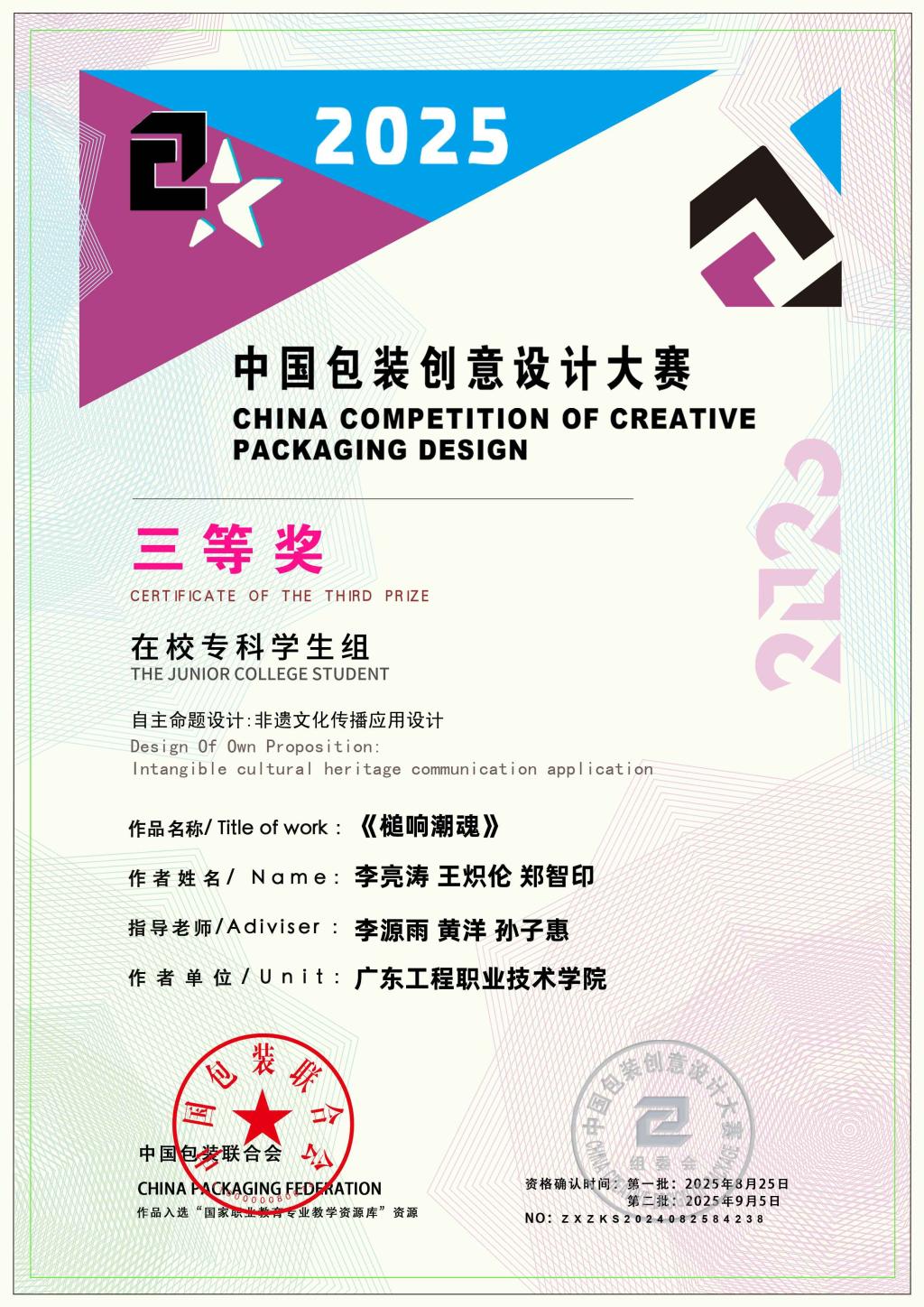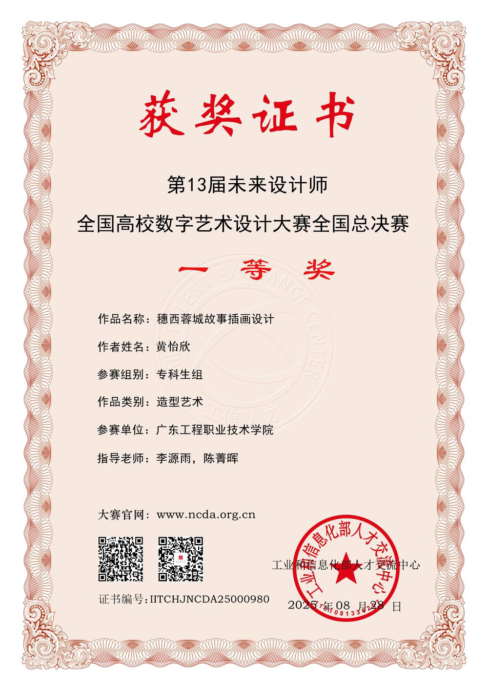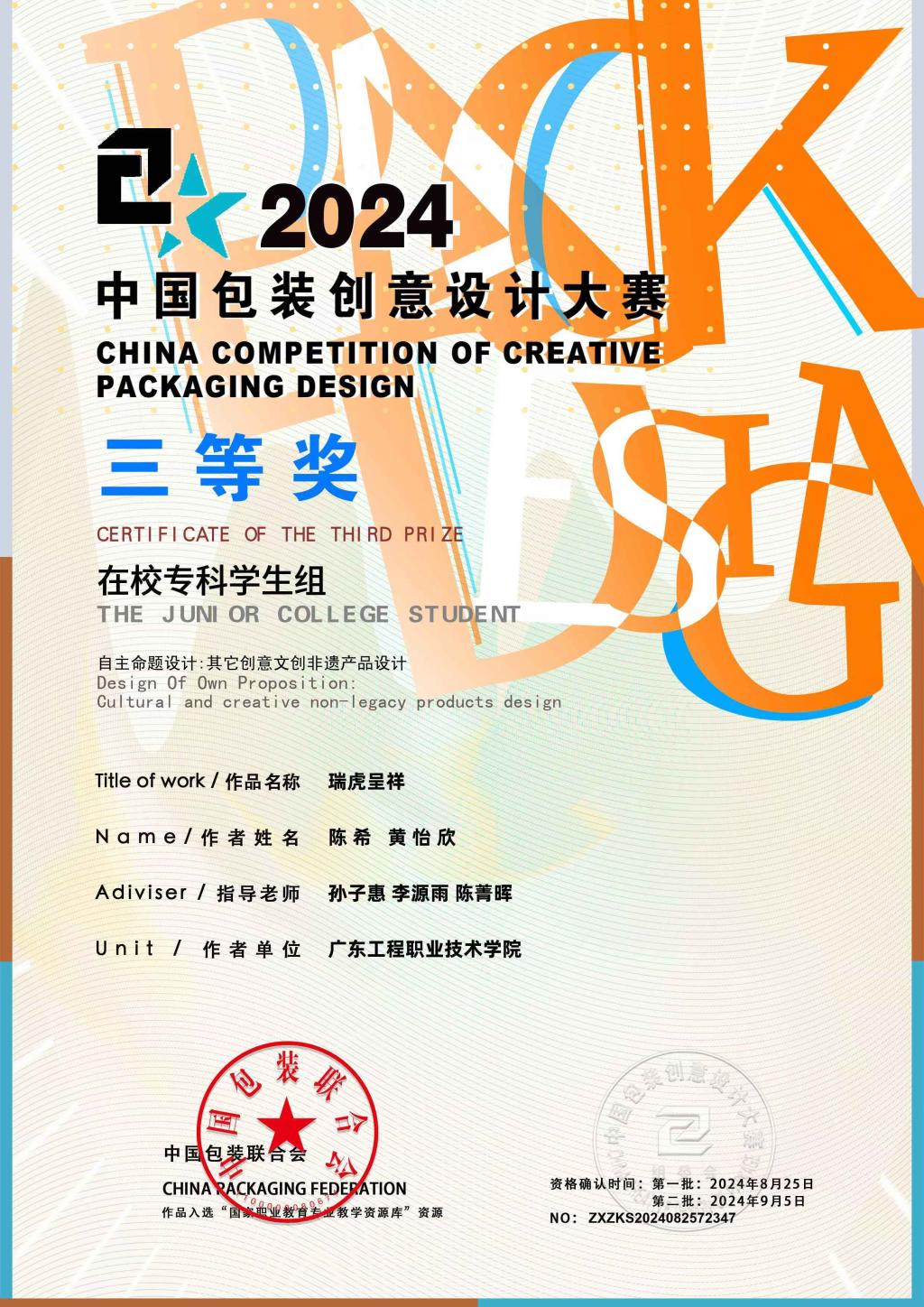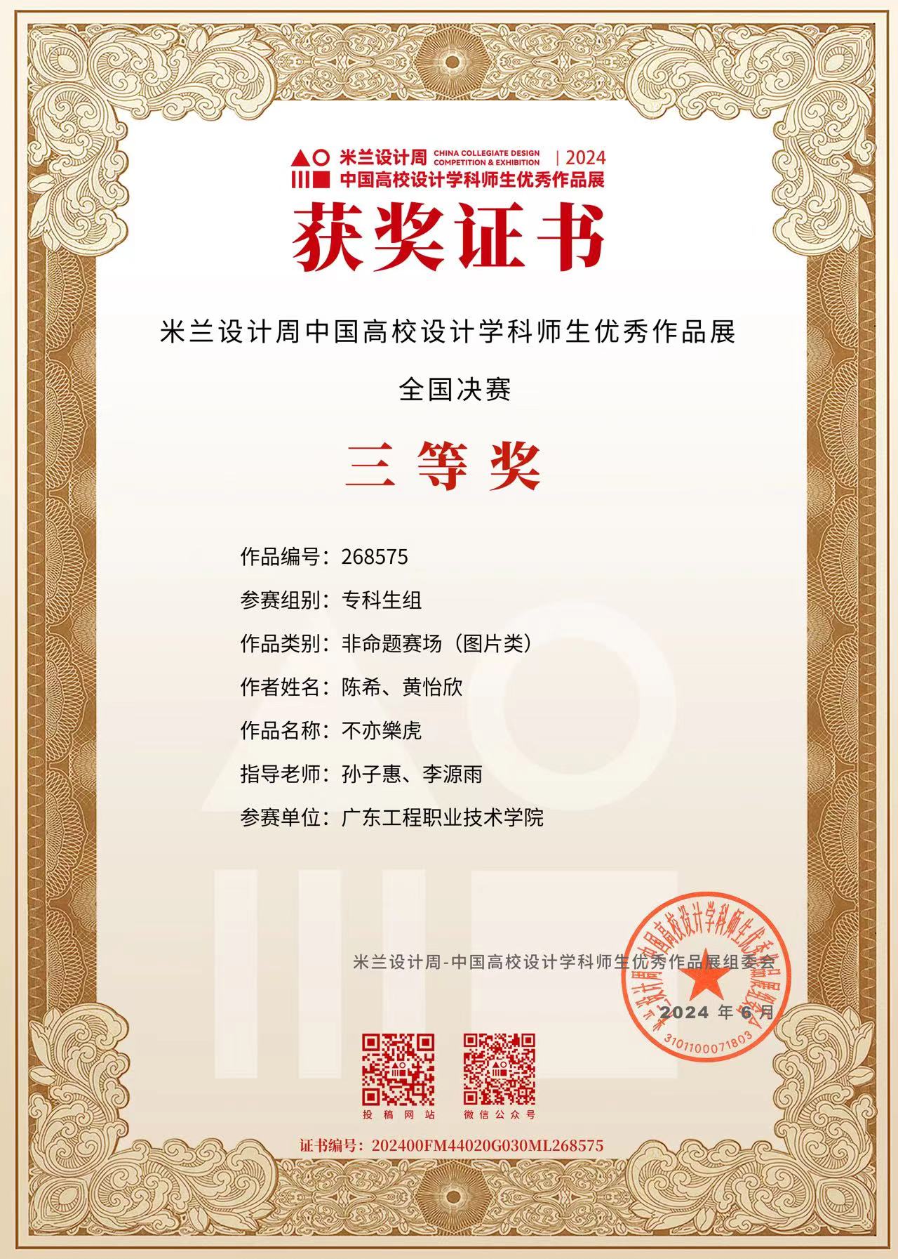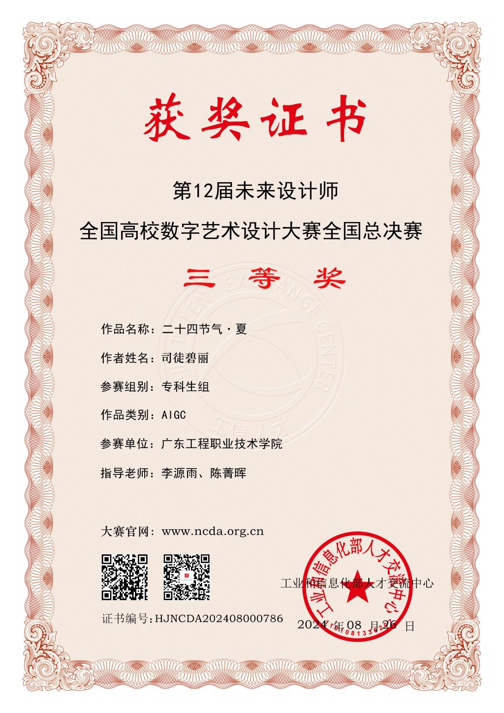 2024年 广东省第七届高校(高职)青年教师教学大赛二等奖、广东省第二届高校美育教师教学基本功比赛一等奖、2024第12届未来设计师·全国艺术设计教师教学创新大赛全国总决赛一等奖