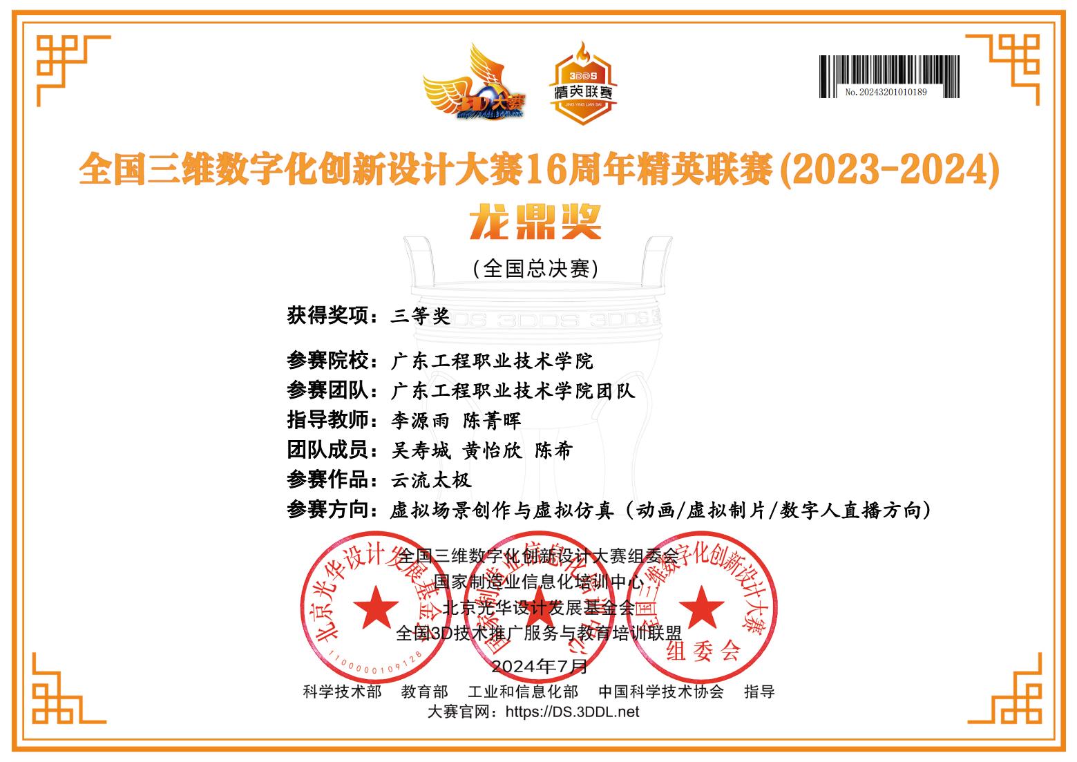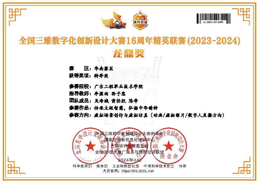 2024年 指导学生参加2024第12届未来设计师·全国高校数字艺术设计大赛获全国总决赛三等奖1项,广东赛区二等奖1项;指导学生参加全国三维数字化创新设计大赛获全国总决赛三等奖1项,华南赛区特等奖1项