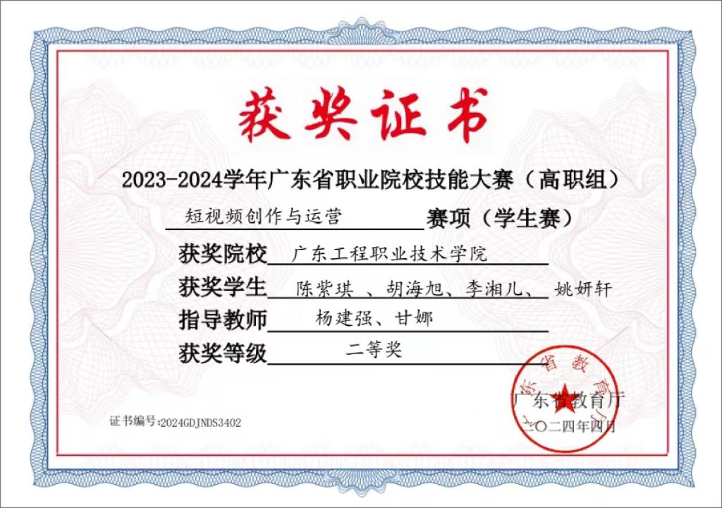 2024 2023-2024年度指导学生参加广东省高职院校专业技能大赛--短视频制作及运营赛项获得省二等奖1项