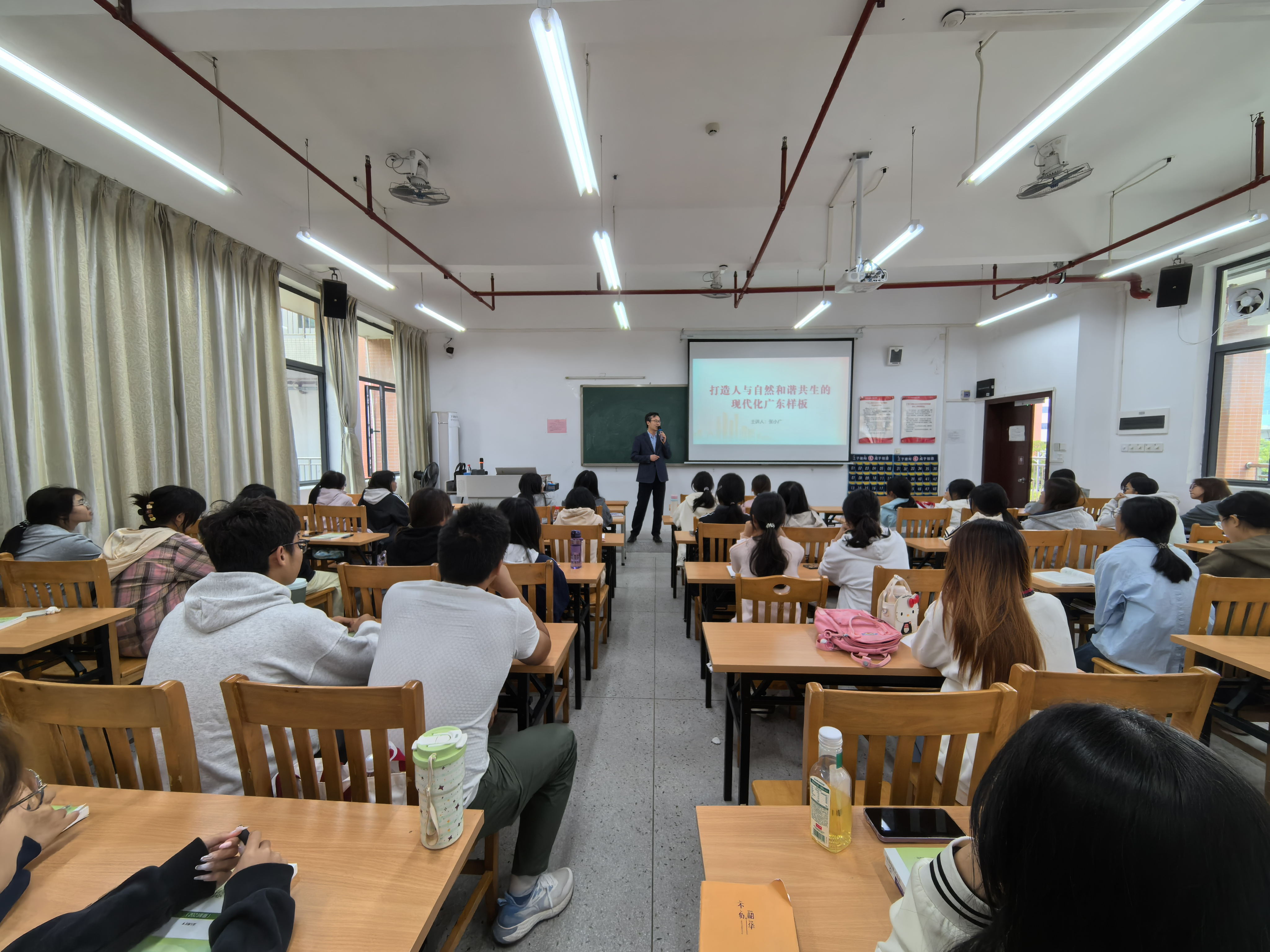 10月22日上午,学校党委委员、副校长张小广以“打造人与自然和谐共生的现代化广东样板”为题,为2025级旅游英语专业同学讲授“思政第一课”。张小广副校长围绕习近平生态文明思想的核心要义,以广东生态文明建设为切入点,分析广东深入推进生态文明建设的生动实践,展示绿美广东生态文明建设的经验启示。授课过程中,张小广副校长阐释了习近平生态文明思想的理论内涵和实践意蕴,以贴近学生生活的语言和形式,充分调动了课堂氛围,有效激发了同学们投身广东生态文明建设的热情与责任感,引导大家深刻认识到新时代青年在推动绿色发展、建设美丽中国中的使命担当。