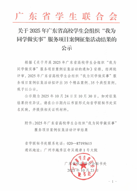 近日,广东省学生联合会发布 2025 年广东省高校学生会组织 “我为同学做实事” 服务项目案例征集活动结果揭晓,经资格审查、专家评审两轮严格遴选,我校智能工程学院学生会申报项目《“三进三促” 职业成长护航计划》脱颖而出,成功入选全省精品案例,我校是仅有的2所获此殊荣的高职院校之一。