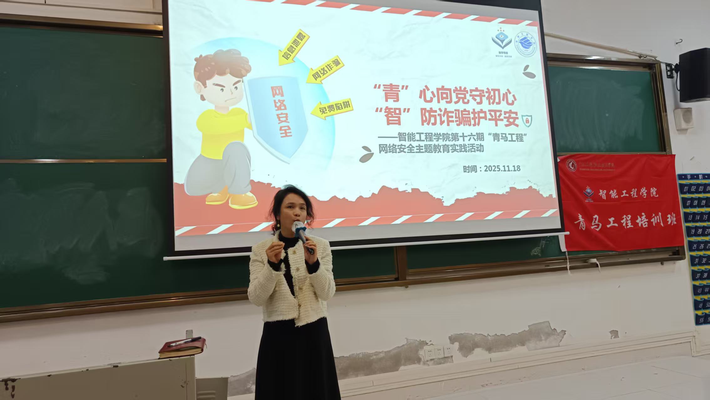 “未知链接不点击,陌生来电不轻信,个人信息不透露……”11月18日,在实训5号楼101室,一场以“青”心向党守初心、“智”防诈骗护平安为主题的网络安全主题教育实践活动正热烈开展。作为学院第十六期“青马工程”培训班的重要实践课程,此次活动通过理论宣讲、案例警示、集体承诺等多元形式,为青年学子敲响反诈警钟,以“青言青语”织密校园网络安全“防护网”。学院党委副书记曾婉玲,全体辅导员和班主任代表,200名学生参会。会议由学院团委书记林莹主持。