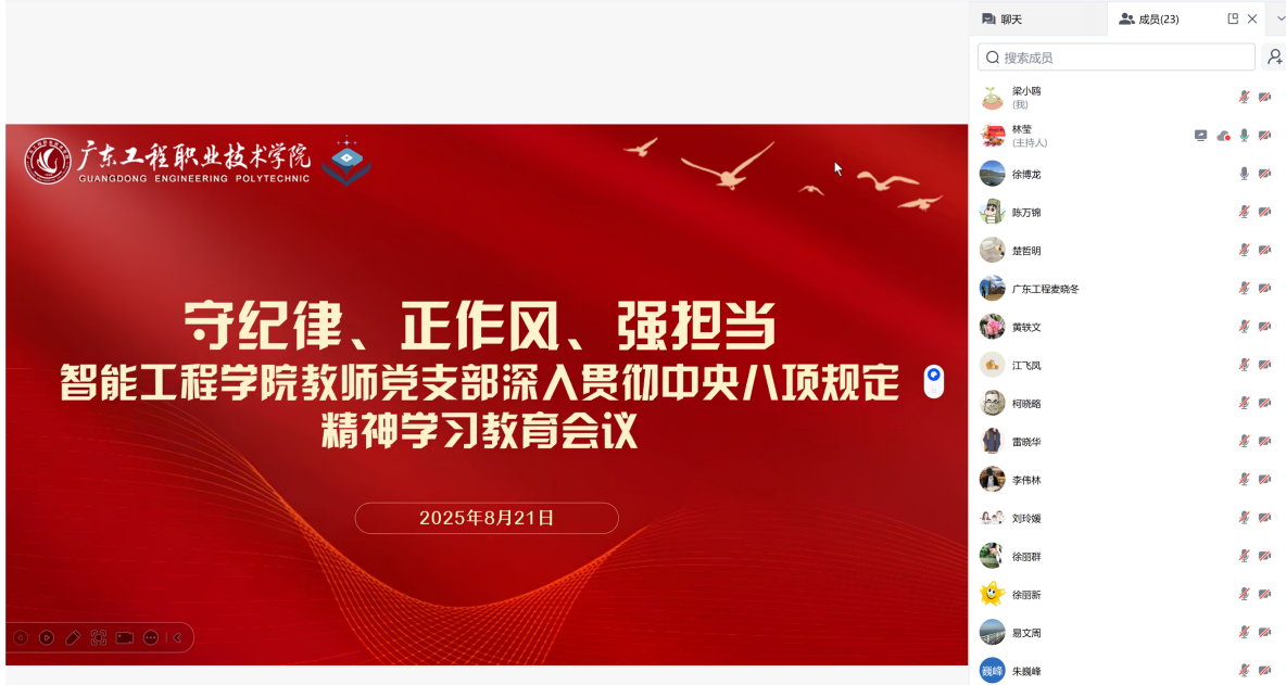 8月21日,智能工程学院教师党支部以线上会议形式召开“守纪律、正作风、强担当——深入贯彻中央八项规定精神学习教育”主题党员大会,会议由党支部副书记林莹主持,全体教师党员参加。