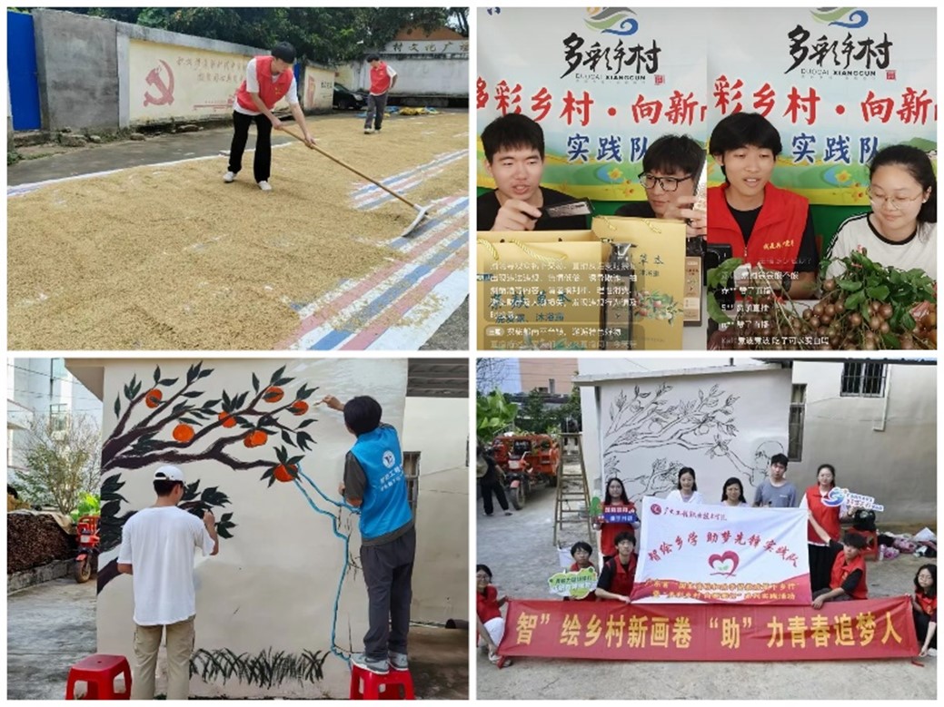 为深入落实党的二十大关于“发展乡村特色产业,拓宽农民增收致富渠道”的部署要求,紧扣中央农村工作会议关于“把产业振兴作为乡村振兴重中之重”的部署,实践队通过多元举措,助力乡村产业振兴与文化繁荣。晒谷场里悟农情: 队员们深入村民晒谷地,在农户指导下亲身体验摊谷、翻晒、拢谷等传统农艺,亲身感悟“一粥一饭,当思来处不易”的农耕智慧,理解“产业振兴始于田间地头”的实践意义。直播带货拓销路: 实践队在“平台镇客厅”开设金穗助农直播间,队员们化身主播,手持郁南特色水果黄皮与本土草本洗头水,生动讲述产品故事。三小时的公益直播中,有效提升了产品知名度,为拓宽销路奠定基础。企业调研探路径:实践队走访广东温氏家禽有限公司,学习其“公司+农户”助农增收模式及禽产品深加工产业链;调研碳原科技(云浮)有限公司,了解秸秆等废弃物“变废为宝”的环保技术。调研互动中围绕农产深加工、循环经济等议题与企业交流,收集产业升级合作资料。墙绘添彩焕新颜:实践队在村居开展文化墙绘创作,以艺术赋能乡村环境美化,绘制展现乡村产业特色的主题墙绘,成为展现乡村风貌与产业特色、美化人居环境的亮丽风景线。
