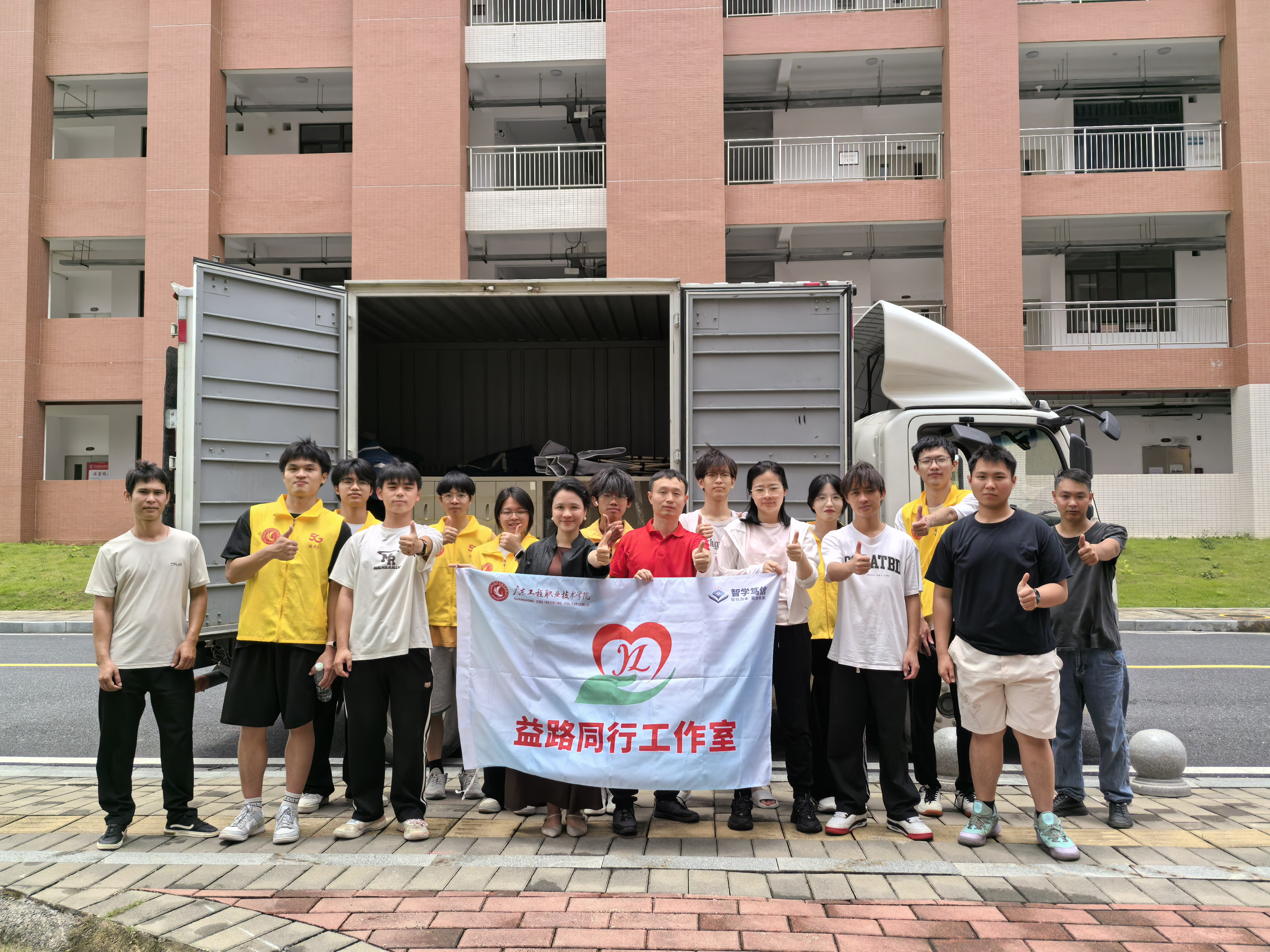 搬迁日,师生把控各楼层关键节点,确保转运全程“零差错、零延误”。益路同行工作室招募的“红马甲”军团成为攻坚主力,烈日下两两扛运重物汗透衣背,飞驰转运推车精准穿梭,严谨核验每件行李信息“小心点”、“我来抬”的互助声此起彼伏,用汗水浇灌出最温暖的搬迁风景线。