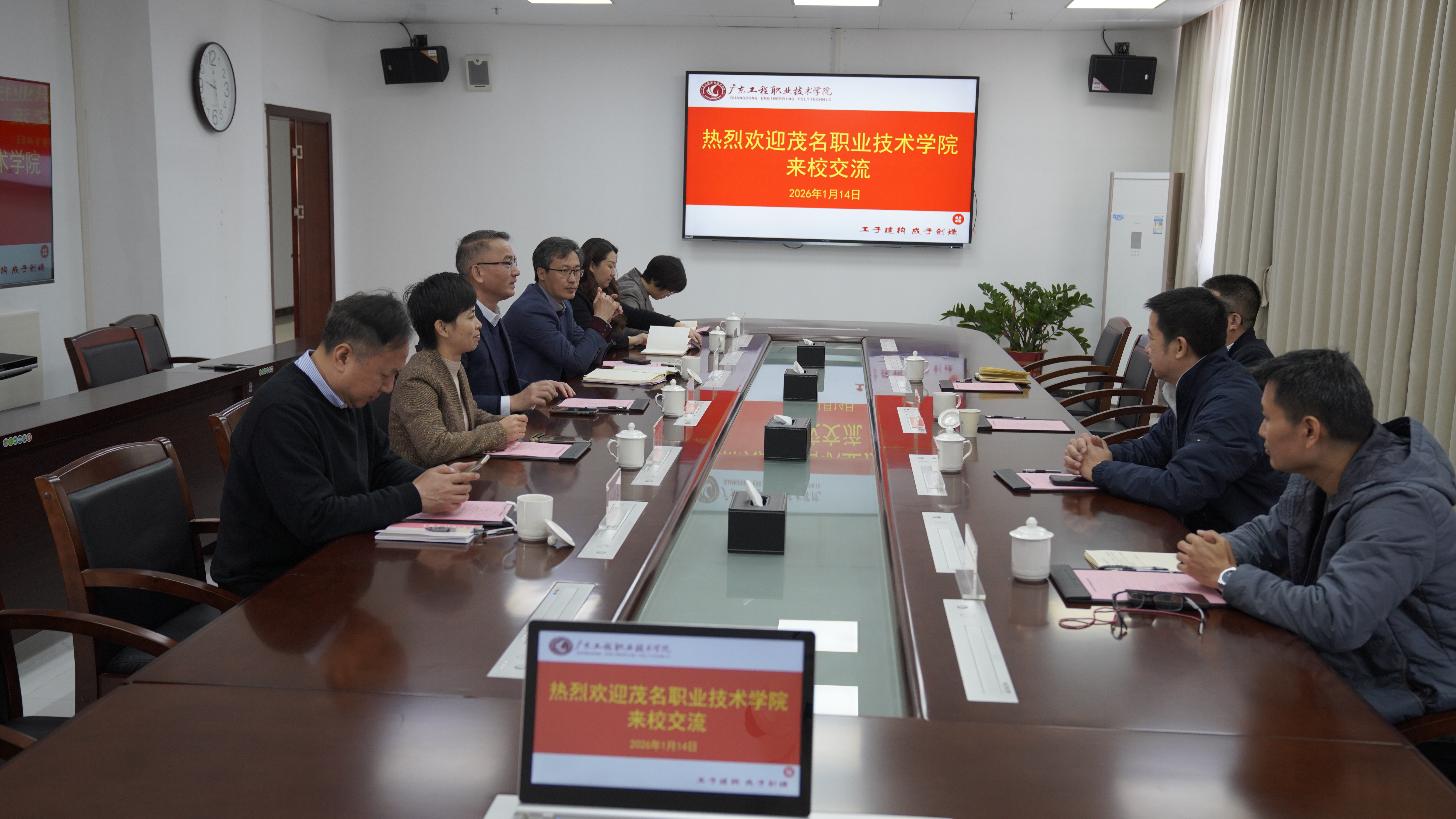 2026年1月14日上午,茂名职业技术学院校长邓毛程带队到学校清远校区交流。学校党委书记叶忠明、副校长张小广热情接待客人,并参加座谈交流。