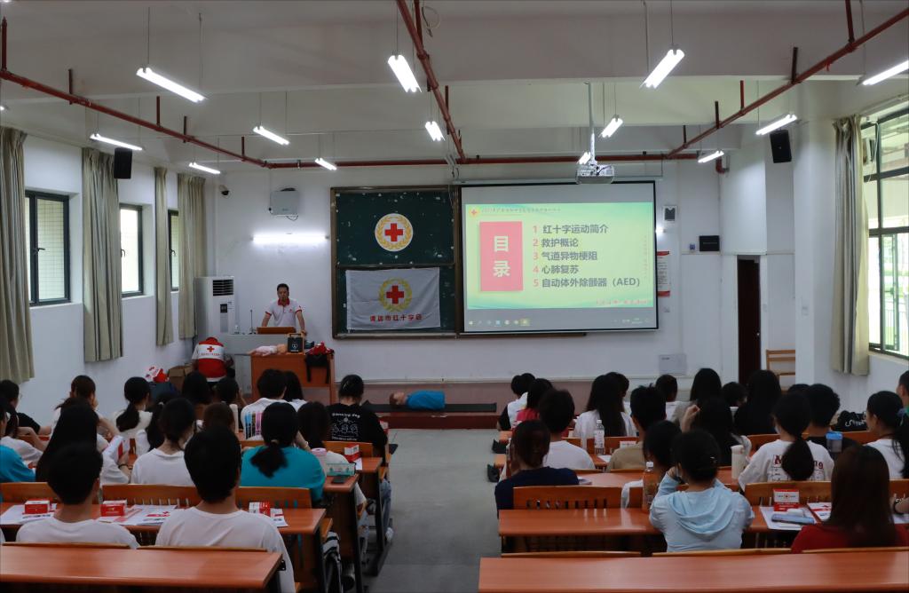 为加强生命健康教育,提高学生自救互救能力,进一步推动高水平安全文明校园建设,5月20日、27日、28日分别在省职教城(清远)校区教学楼Q1-110和Q1-105组织开展了三期红十字应急救护员培训活动,此次急救培训由广东省红十字会主办,清远市红十字会和校红十字会承办。清远市红十字会罗伟添主任、学校总务后勤部(保卫部)陈艳芬医生出席本次活动,共150名师生参加了培训。
