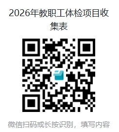 四、体检项目分必检项目和自选项目,教职工根据个人情况选择自选项目,预约体检日期及乘车情况,微信扫描以下二维码填写《2026年教职工体检项目收集表》信息。