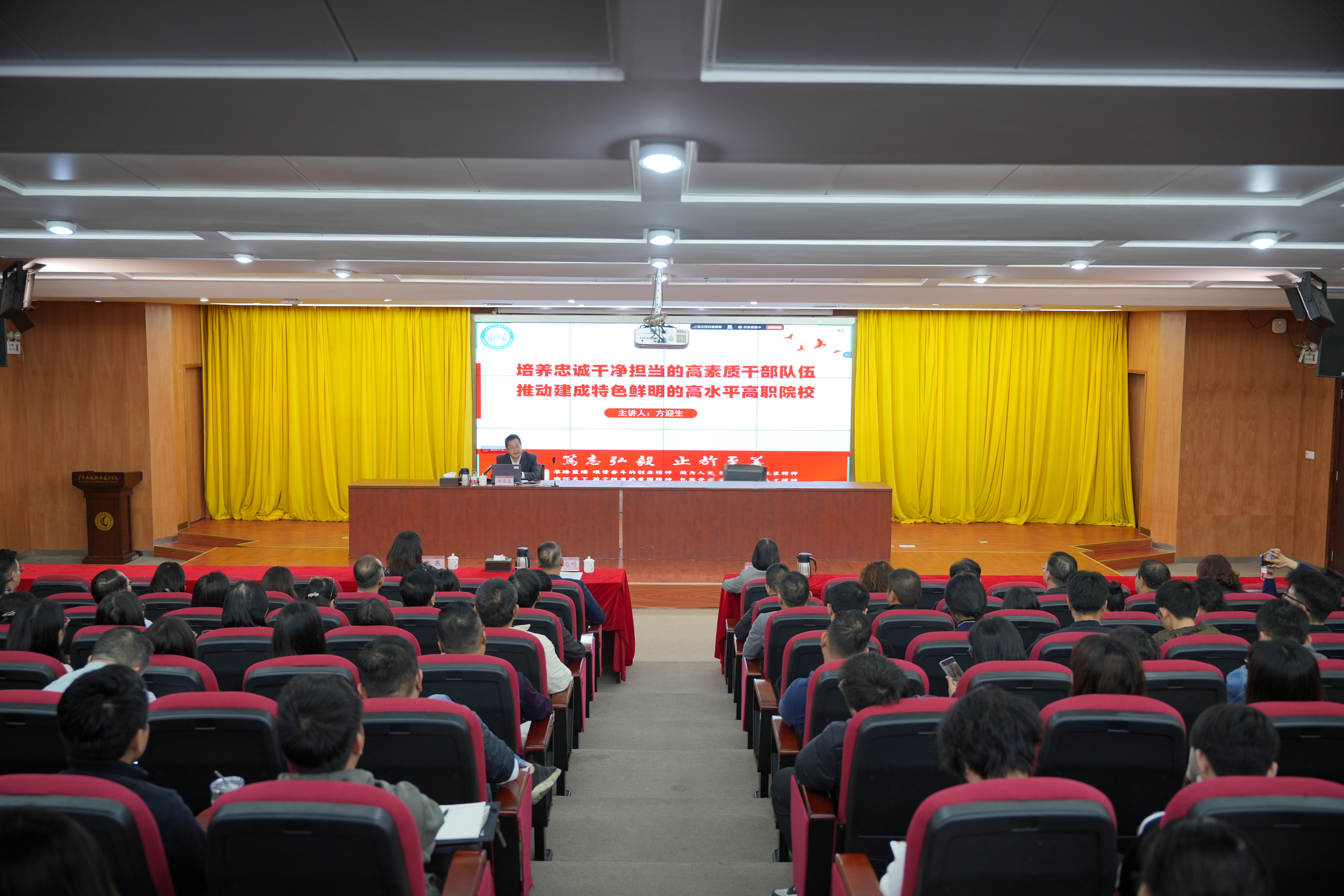 会上,方迎生书记以《培养忠诚干净担当的高素质干部队伍 推动建成特色鲜明的高水平高职院校》为主题,分别从“充分认识加强干部队伍建设的重要性,并将其作为战略问题来抓”“做优干部‘选、育、管、用’全链条机制,凝聚起干事创业精气神”“聚焦提高干部治理能力,着力解决‘想不想干’‘能不能干’‘如何干’等问题”“聚焦‘三个始终坚持’,全力推动学校事业实现高质量发展”等四个方面,结合广东松山职业技术学院的改革实践,通过详实案例、具体数据分享了松山职院以培养忠诚干净担当的高素质干部队伍为关键,推动学校事业高质量发展的成功经验。整场报告主题鲜明、论述深刻、催人奋进,既有理论高度又有实践深度,为我校办学治校提供了宝贵的借鉴和启示。