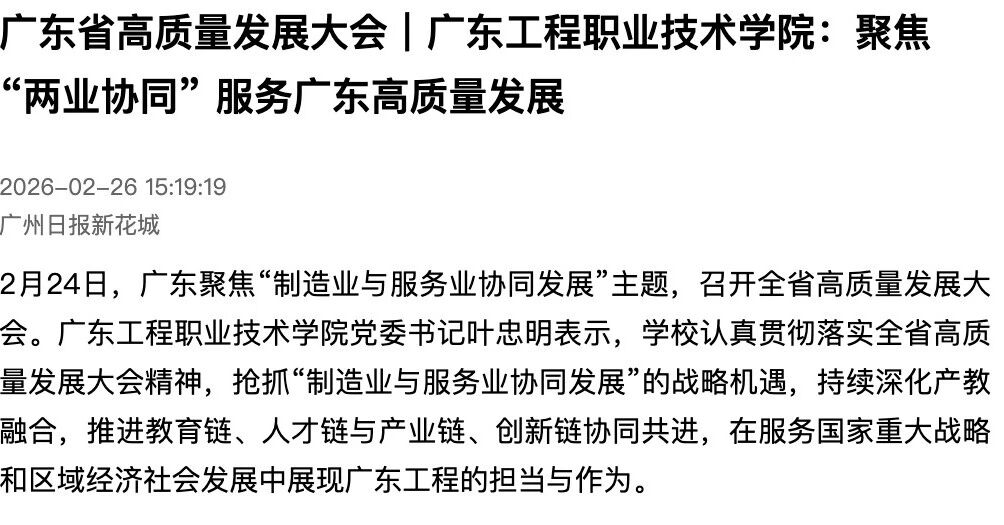 以下是《南方Plus》“广东教育头条”刊发专访报道《广东工程职业技术学院党委书记叶忠明:持续输出“广东工程职教”模式》。