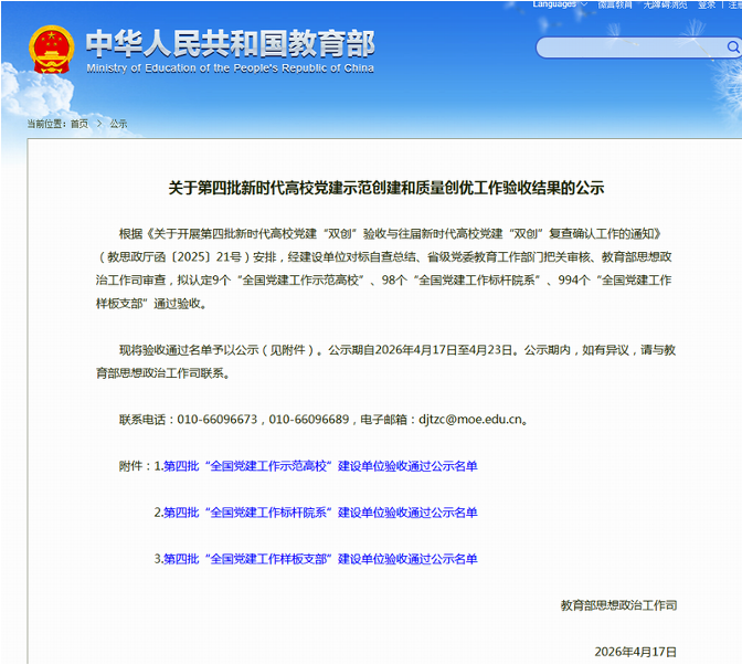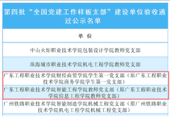 近日,教育部思想政治工作司公布第四批新时代高校党建示范创建和质量创优工作验收结果,我校财经商贸学院学生第一党支部、智能工程学院教师党支部作为第四批“全国党建工作样板支部”建设单位,圆满完成各项创建任务,顺利通过验收。