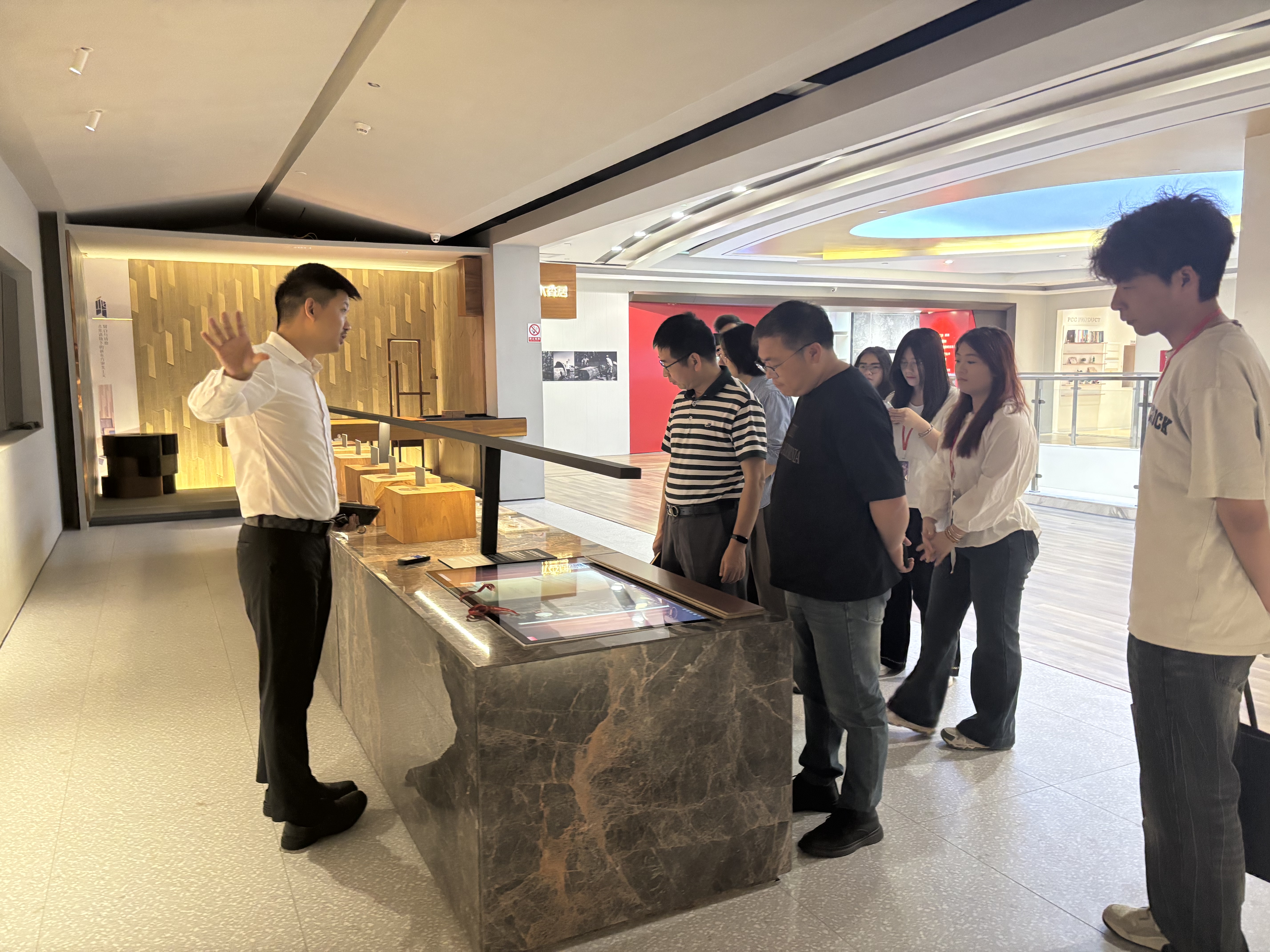 在大自然家居总部及俱美智造工厂负责人的陪同下,王洪波院长一行参观了企业展厅与现代化生产车间。近距离了解了家居行业最新材料、工艺及企业用人标准。双方围绕如何将企业新技术、新工艺融入日常教学进行了现场交流。