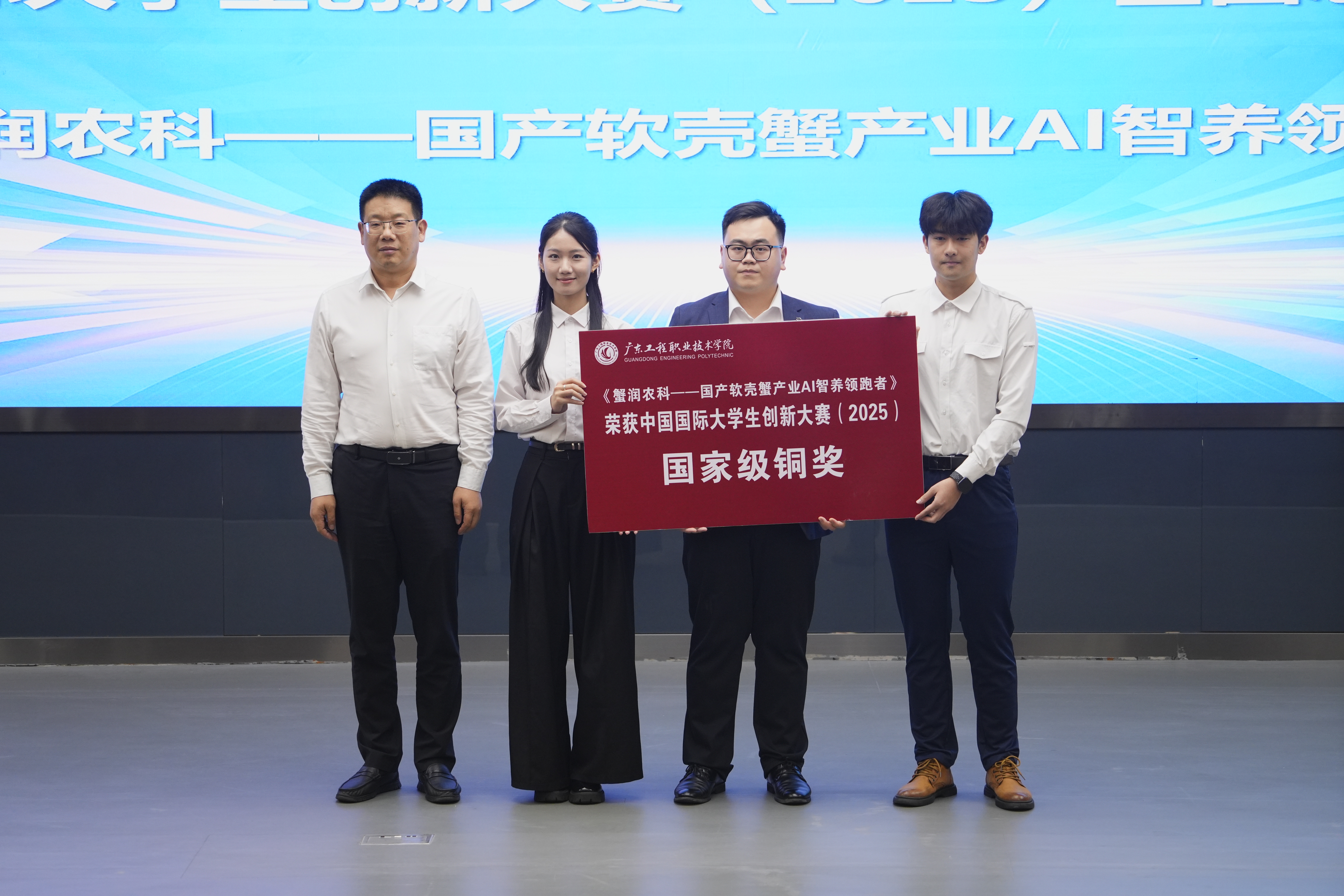在国赛层面,《蟹润农科——国产软壳蟹产业AI智养领跑者》项目团队荣获中国国际大学生创新大赛(2025)全国总决赛铜奖。在省赛层面,《眸视智训——高精度3D视觉微刀具静态检测专家》等6个项目团队分获省赛银奖和铜奖。学校同时荣获广东省分赛学校集体奖。