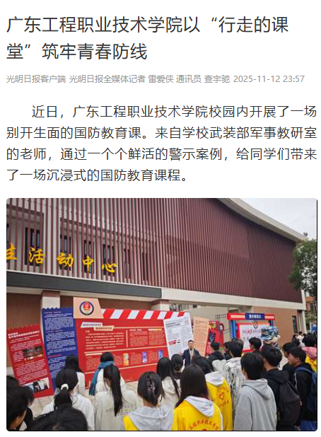 此次活动是广东工程职业技术学院探索创新国防教育实践育人手段的重要举措。学校始终坚持将国防教育与爱国主义教育、国家安全教育有机融合,通过“请进来”与“走出去”相结合的方式,打破课堂与校园的界限,让教育更具吸引力和感染力。(光明日报全媒体记者 雷爱侠 通讯员 查宇驰)