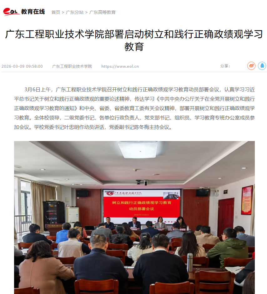 3月6日上午,广东工程职业技术学院召开树立和践行正确政绩观学习教育动员部署会议,认真学习习近平总书记关于树立和践行正确政绩观的重要论述精神,传达学习《中共中央办公厅关于在全党开展树立和践行正确政绩观学习教育的通知》和中央、省委、省委教育工委有关会议精神,部署开展树立和践行正确政绩观学习教育。全体校领导,二级党委书记、各单位行政负责人、党支部书记、组织员、学习教育专班办公室成员参加会议。学校党委书记叶忠明作动员讲话,党委副书记陈冬梅主持会议。