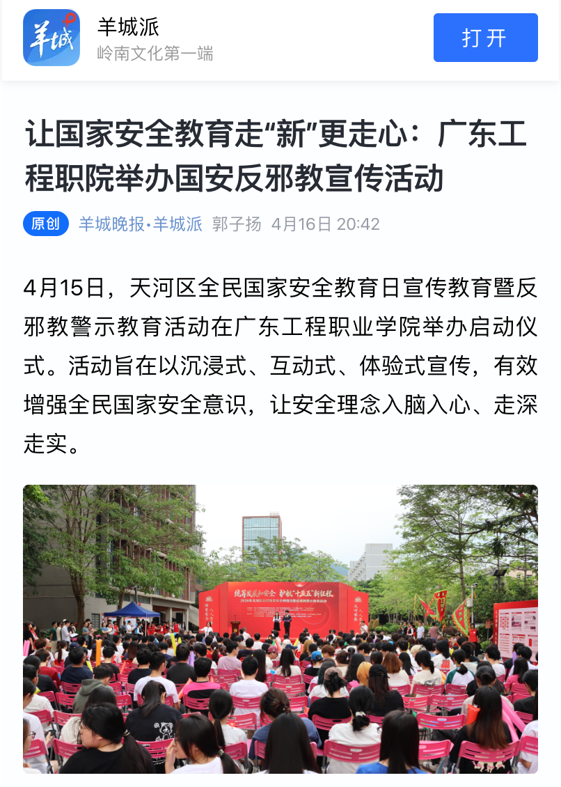 【羊城晚报】让国家安全教育走“新”更走心:广东工程职院举办国安反邪教宣传活动