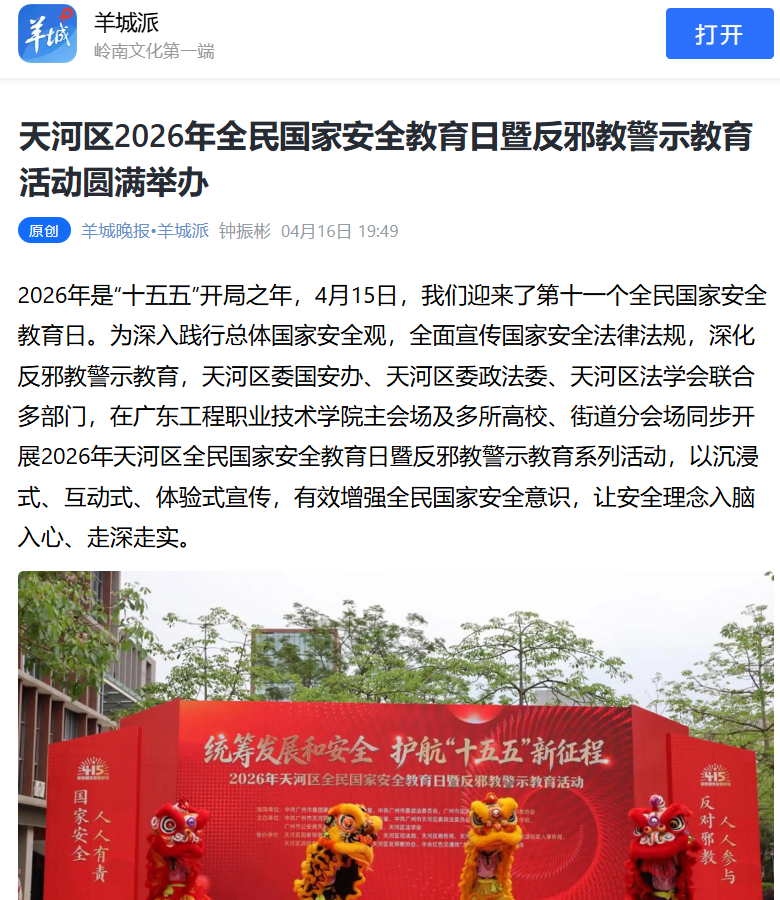 2026年是“十五五”开局之年,4月15日,我们迎来了第十一个全民国家安全教育日。为深入践行总体国家安全观,全面宣传国家安全法律法规,深化反邪教警示教育,天河区委国安办、天河区委政法委、天河区法学会联合多部门,在广东工程职业技术学院主会场及多所高校、街道分会场同步开展2026年天河区全民国家安全教育日暨反邪教警示教育系列活动,以沉浸式、互动式、体验式宣传,有效增强全民国家安全意识,让安全理念入脑入心、走深走实。