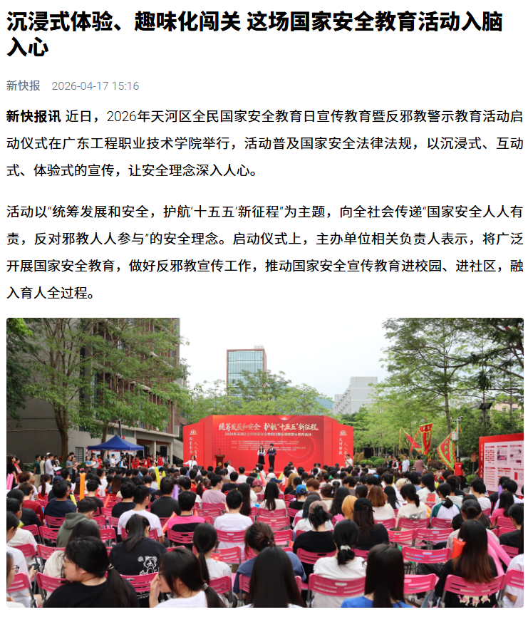 新快报讯近日,2026年天河区全民国家安全教育日宣传教育暨反邪教警示教育活动启动仪式在广东工程职业技术学院举行,活动普及国家安全法律法规,以沉浸式、互动式、体验式的宣传,让安全理念深入人心。
