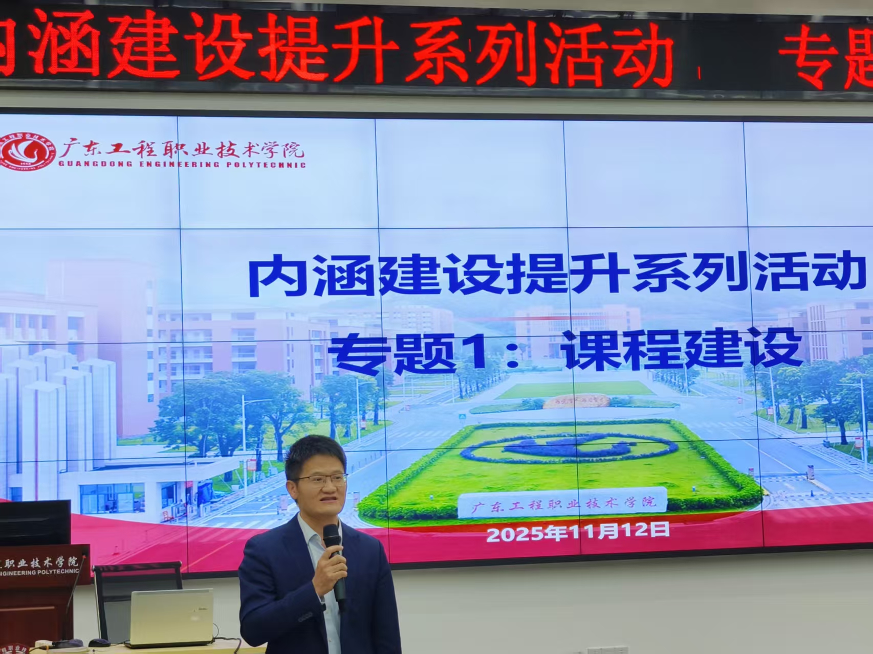 为提升学校课程建设水平与内涵发展质量,2025年11月12日下午,学校在省职教城校区Q1-228多功能厅举办“学校内涵建设提升系列活动”首场专题培训,聚焦“课程建设”主题。学校党委委员、副校长吴志敏出席培训会,各二级学院院长、副院长、全体专业(群)负责人、教研室主任及专任教师代表共同参加。会议由教务部部长朱珍主持。