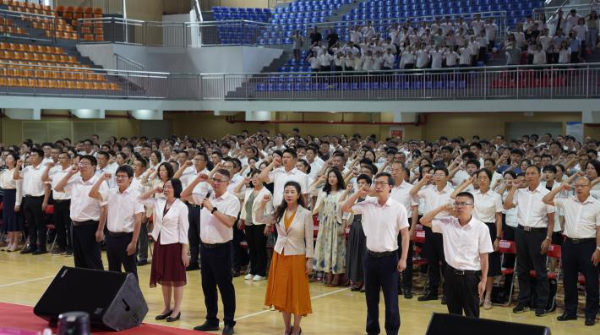 叶忠明书记带领全体教职工面对国旗进行教师宣誓。